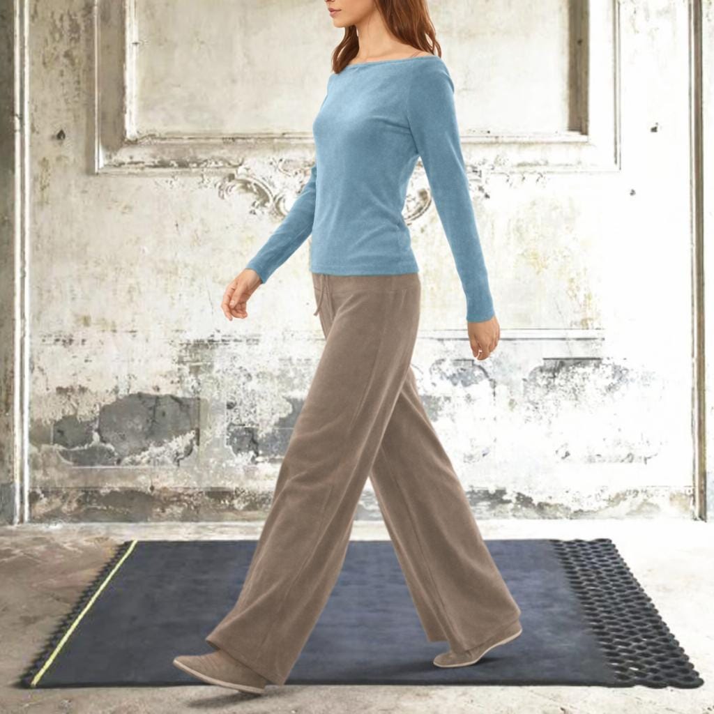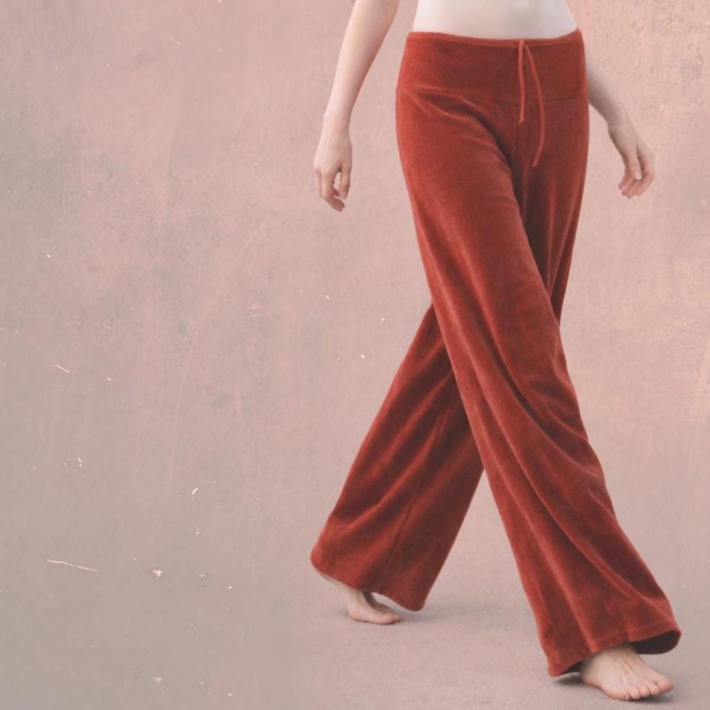 *Elegant wide legged trousers with bended cut hip, finished with a tunnel with string. The bended cut double waistband ensures a perfect fit. Made of supple knitted cotton velvet.