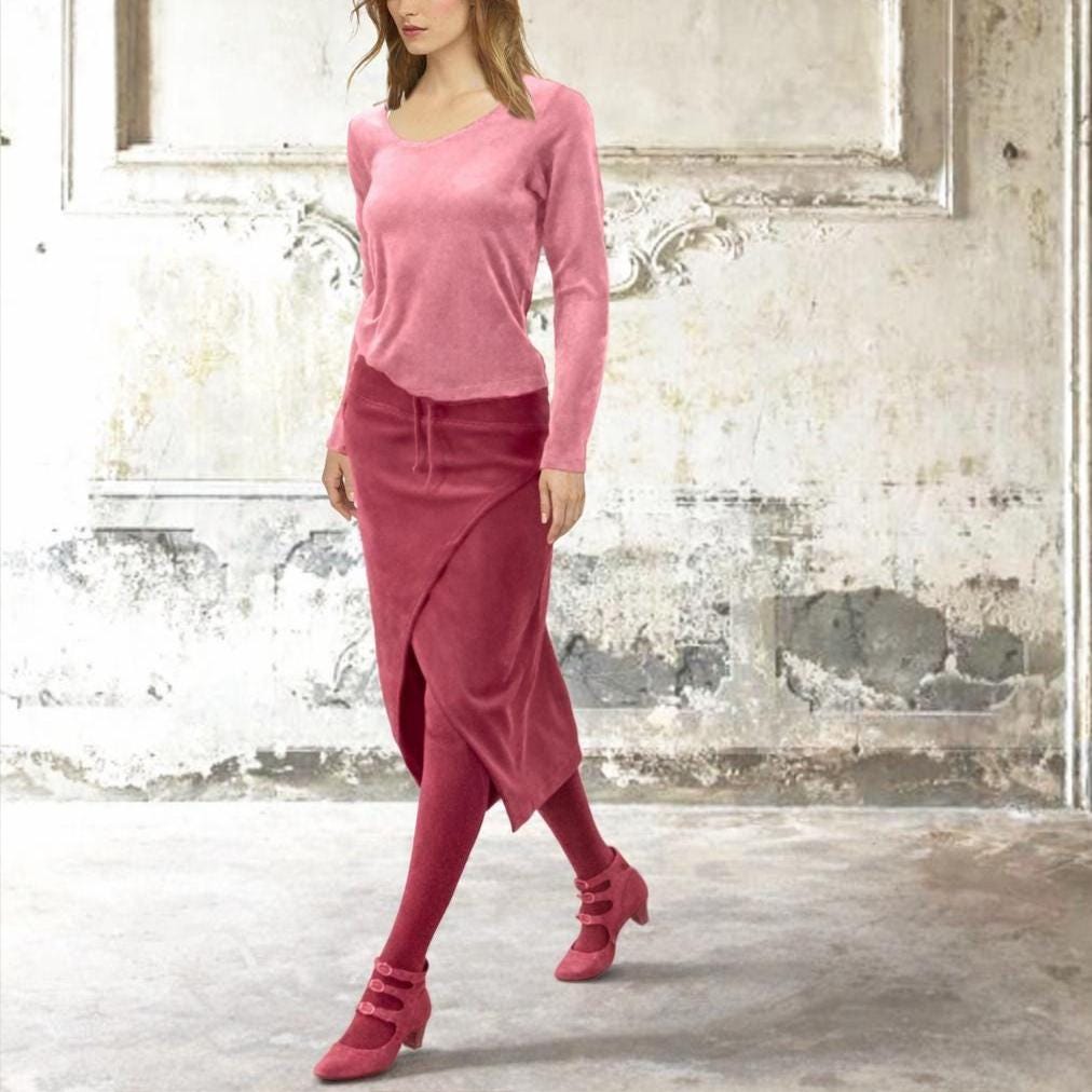 *Model: The skirt fits perfectly in the waist and on the hip due to its wide, round cut, double waistband. A perfect basic garment to be worn on any occasion: wear it casually with a loose fitting jumper or top, or dressed appropriately with a close fitting top or a tailored jacket.