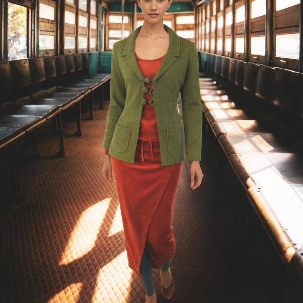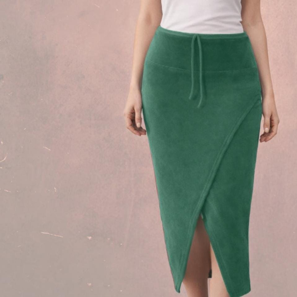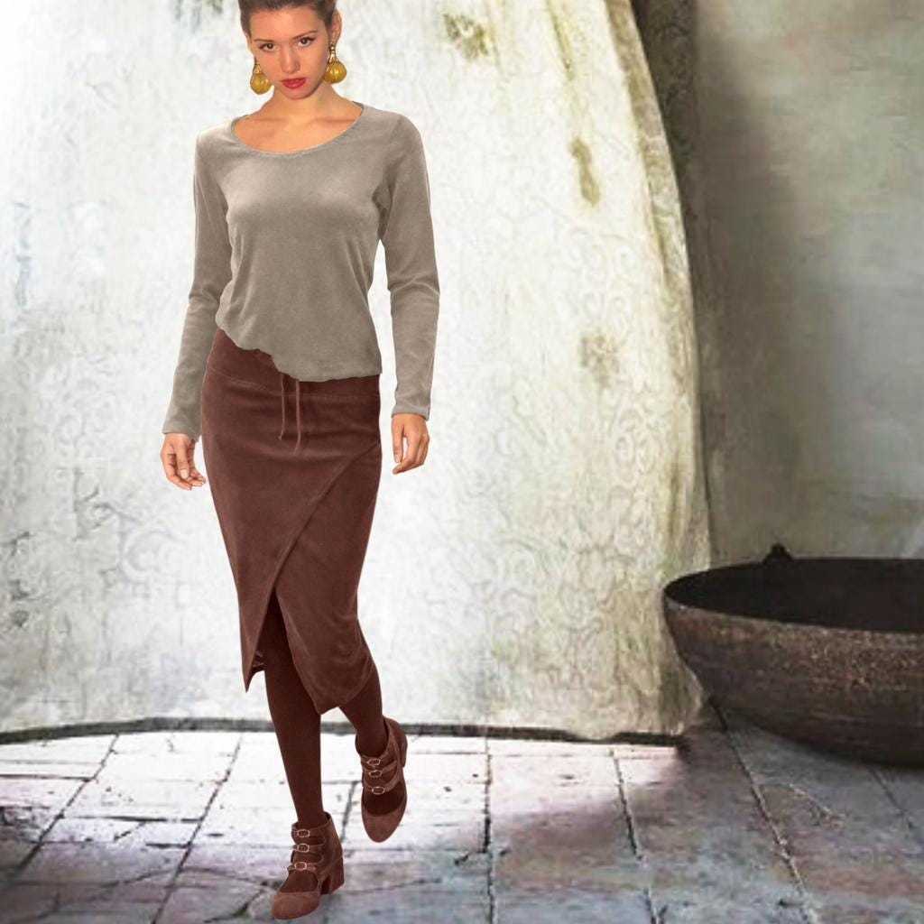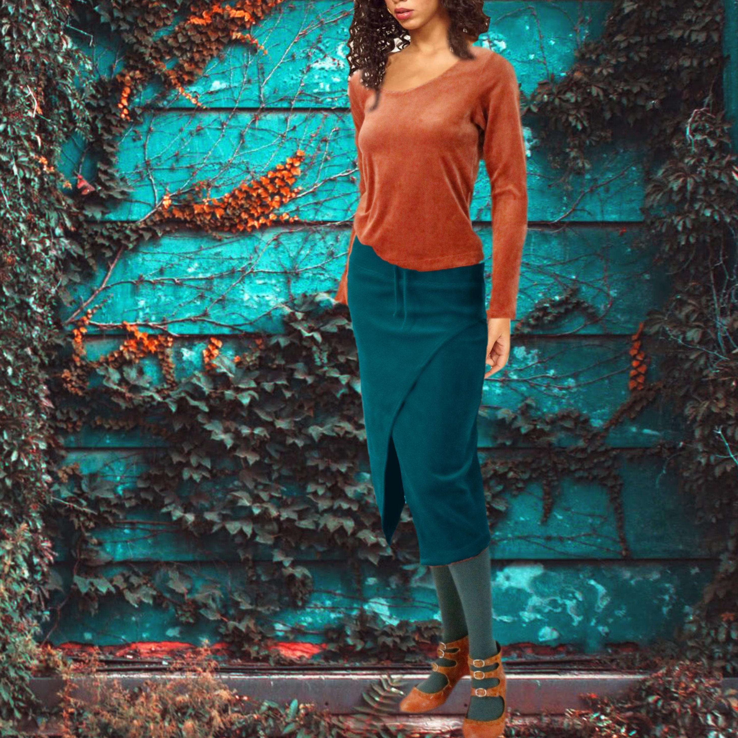 *The fitted pencil skirt has a double round-cut waist/hip part and is finished with a tunnel with drawstring. Large wrap creates an elegant slit.