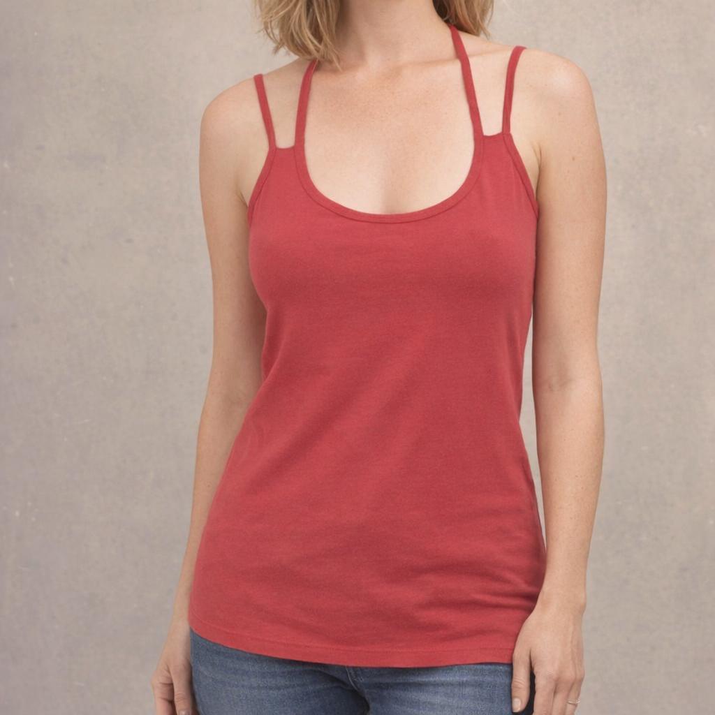 *Close fitting singlet. This must-have basic has a beautiful deep neckline, and double strings: one pair adjustable over the shoulder and the other knotted in the neck. Extra length over the hip. Made of strong quality biological cotton jersey.