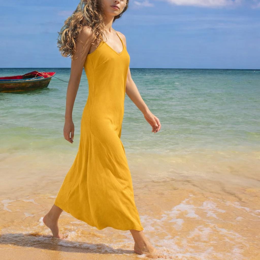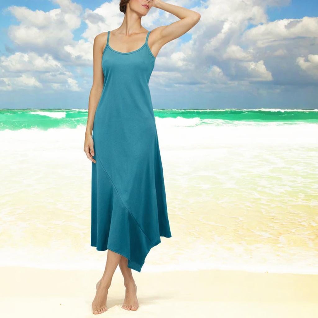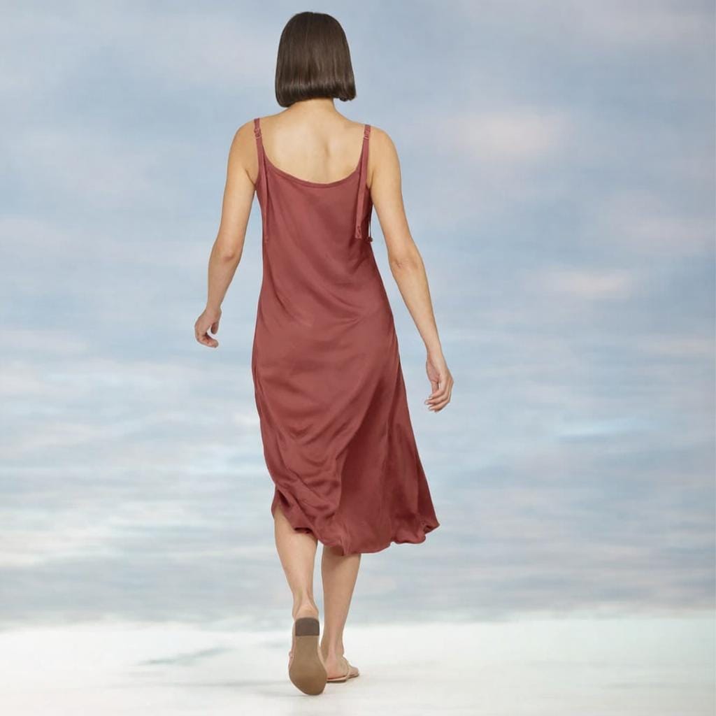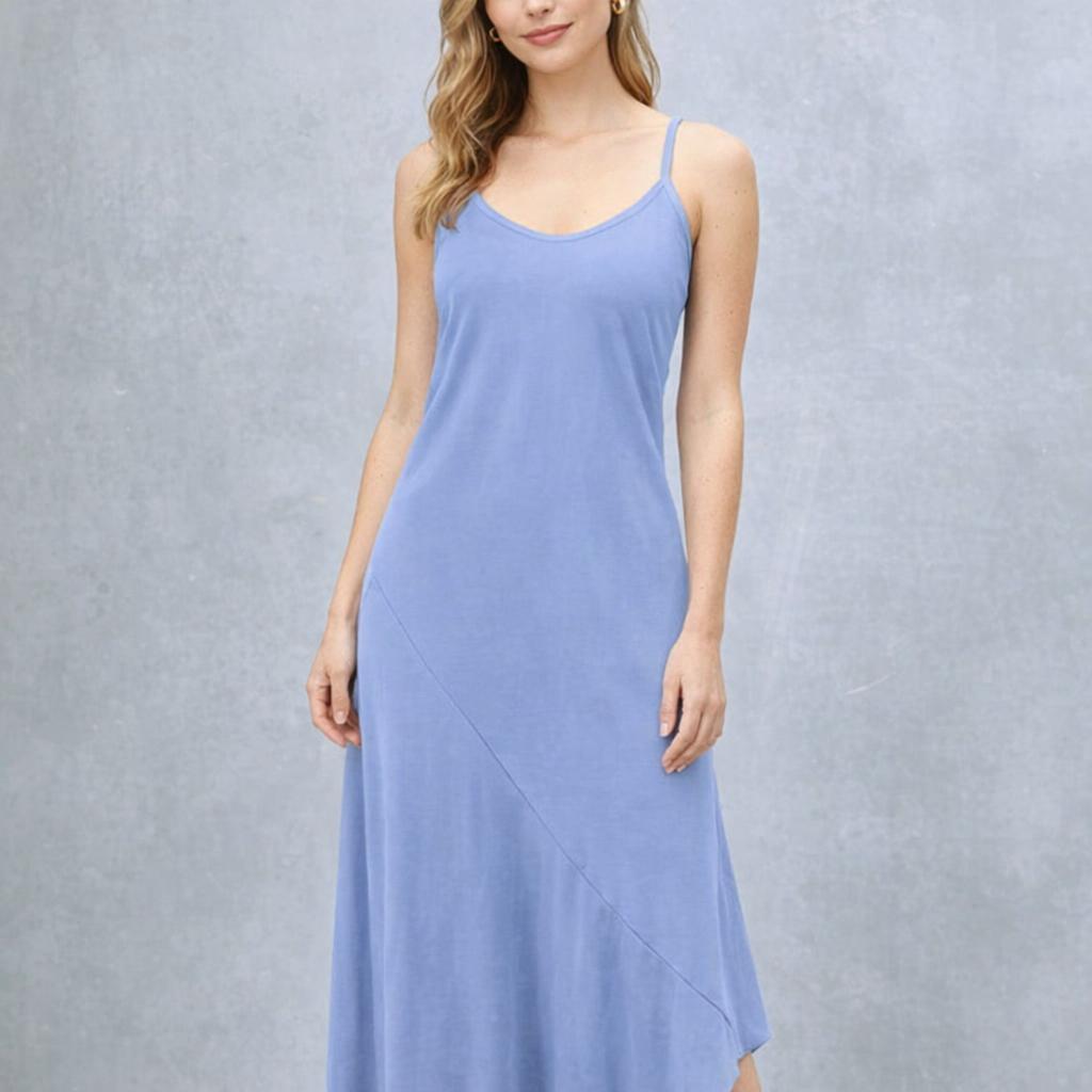 *Summer dress with spaghetti straps made of very smooth, super soft and silky shiny Tencel. The sporty dress has an A-symmetrical hem and adjustable straps. The dress is cut diagonally on the bias for a beautiful sneaky silhouet.