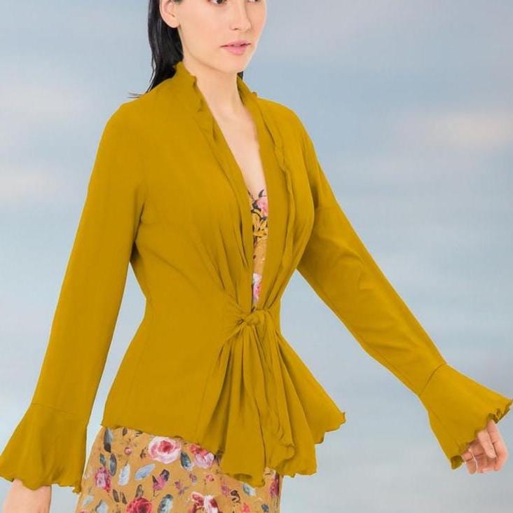 *Cardigan made of organic cotton jersey. The cardigan has an hourglass line ,closure at the waist with a bow and a beautiful draped collar. Collar and hems are finished with ruffles.