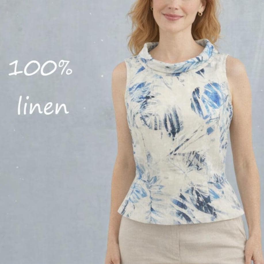 *Slightly tailored, sleeveless blouse made of 100% linen. It has a deep slit at the back which can be closed with a cord on the waist. By adjusting the cord, the blouse can be fitted to your liking. The boatneck collar gives the blouse a retro look.