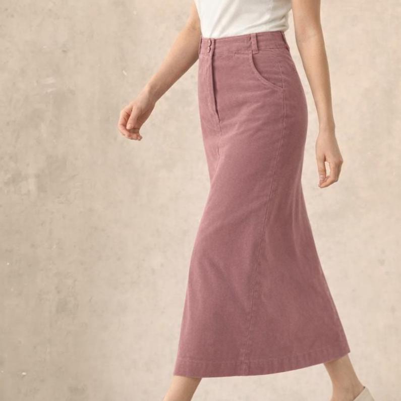 Trending skirt in a feminine pencil shape. Great in combination with a soft or tough sweater and ankle boots. The round cut waistband fits well. Front and back pockets.