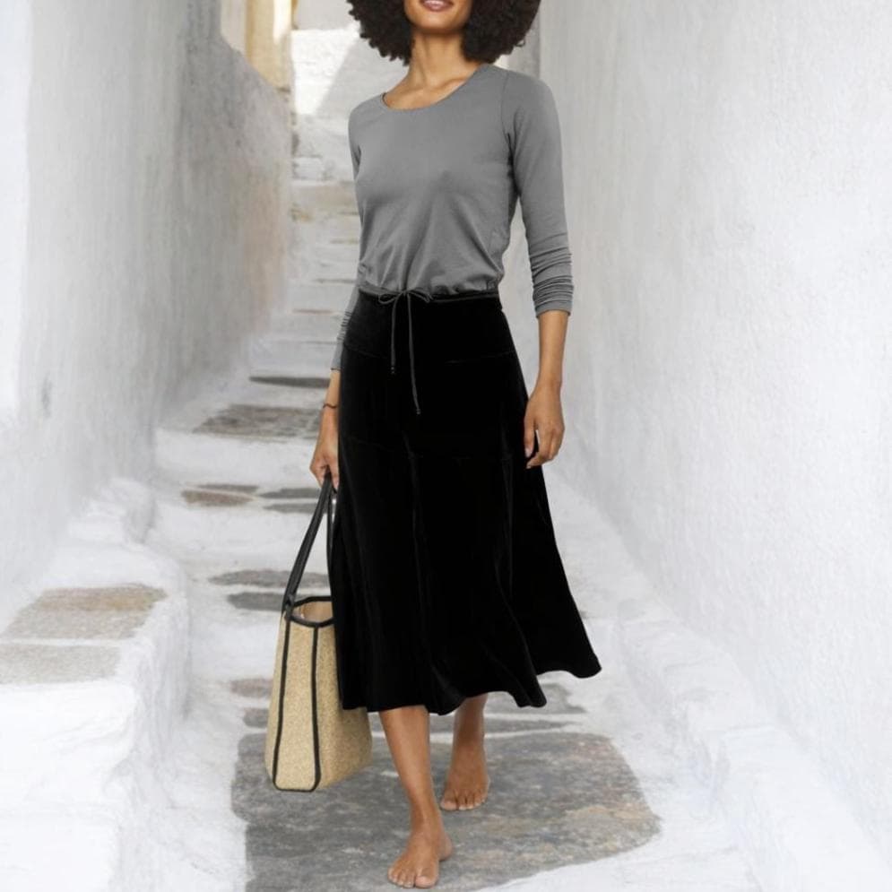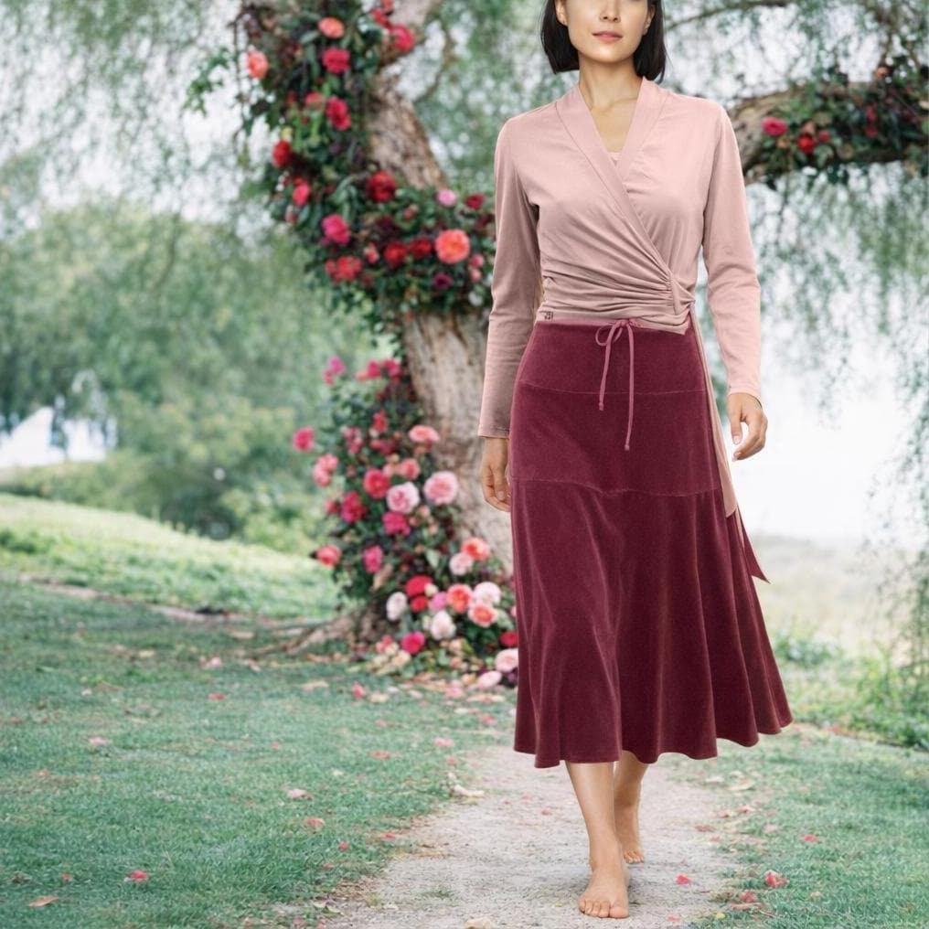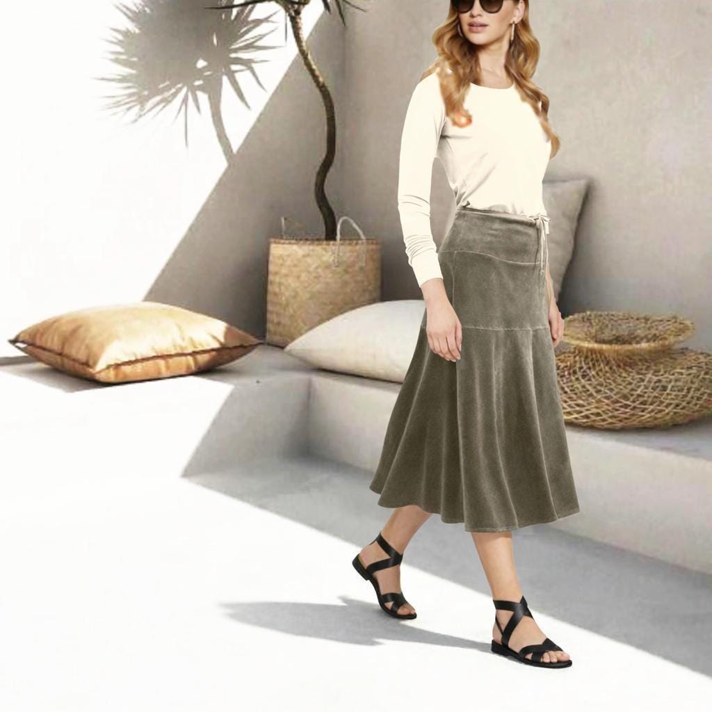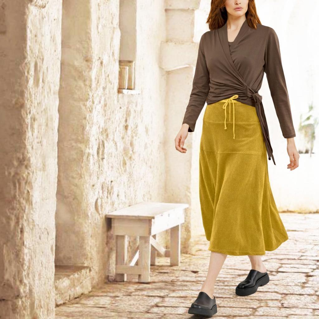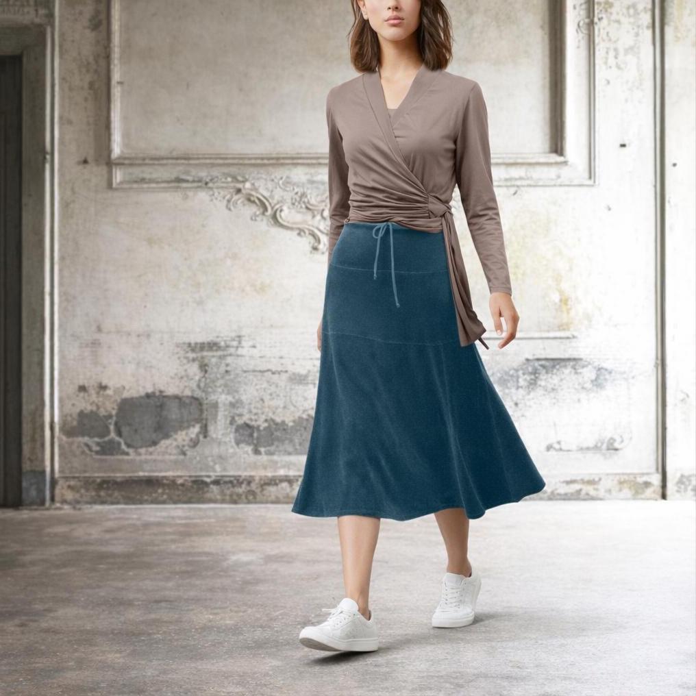 *Elegant and sporty midi skirt made of comfortable nicky velours. Fitted and bended cut hip, finished with a tunnel with string. The bended cut hip ensures a perfect fit. Made of supple knitted (stretching) cotton velvet.