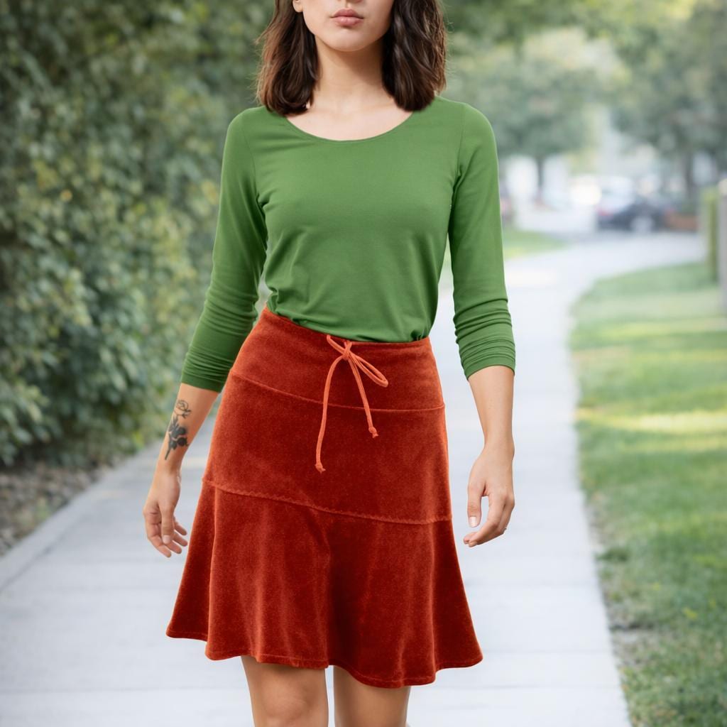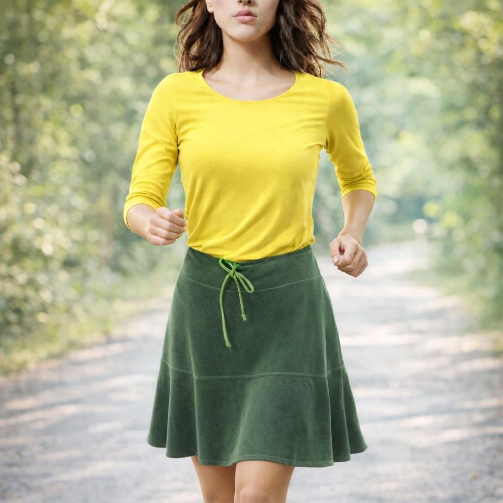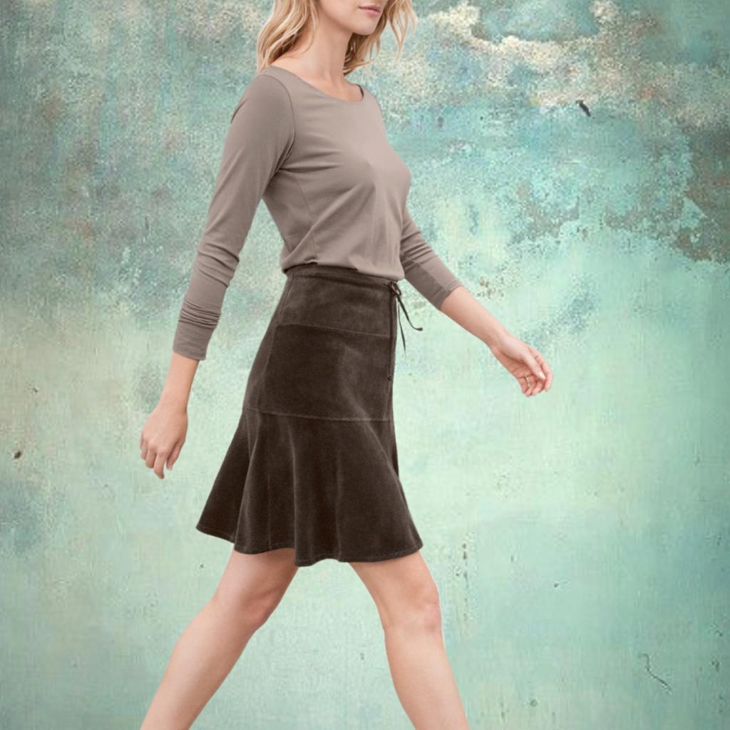 *Elegant and sporty skirt made of comfortable nicky velours. Fitted and bended cut hip, finished with a tunnel with string. The bended cut hip ensures a perfect fit. Made of supple knitted (stretching) cotton velvet.