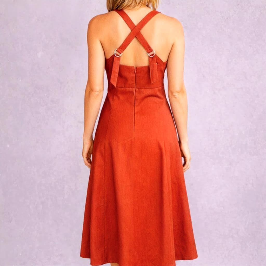 *Marlene dress. The seam under the chest, the fitting waist and the flared skirt give the dress a beautiful feminine line. The wide shoulder straps cross on the back and are adjustable. Zipper at center back and lined bodice.