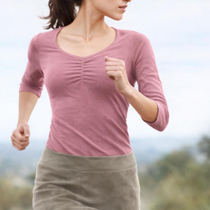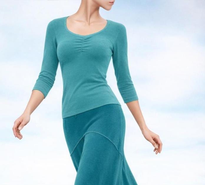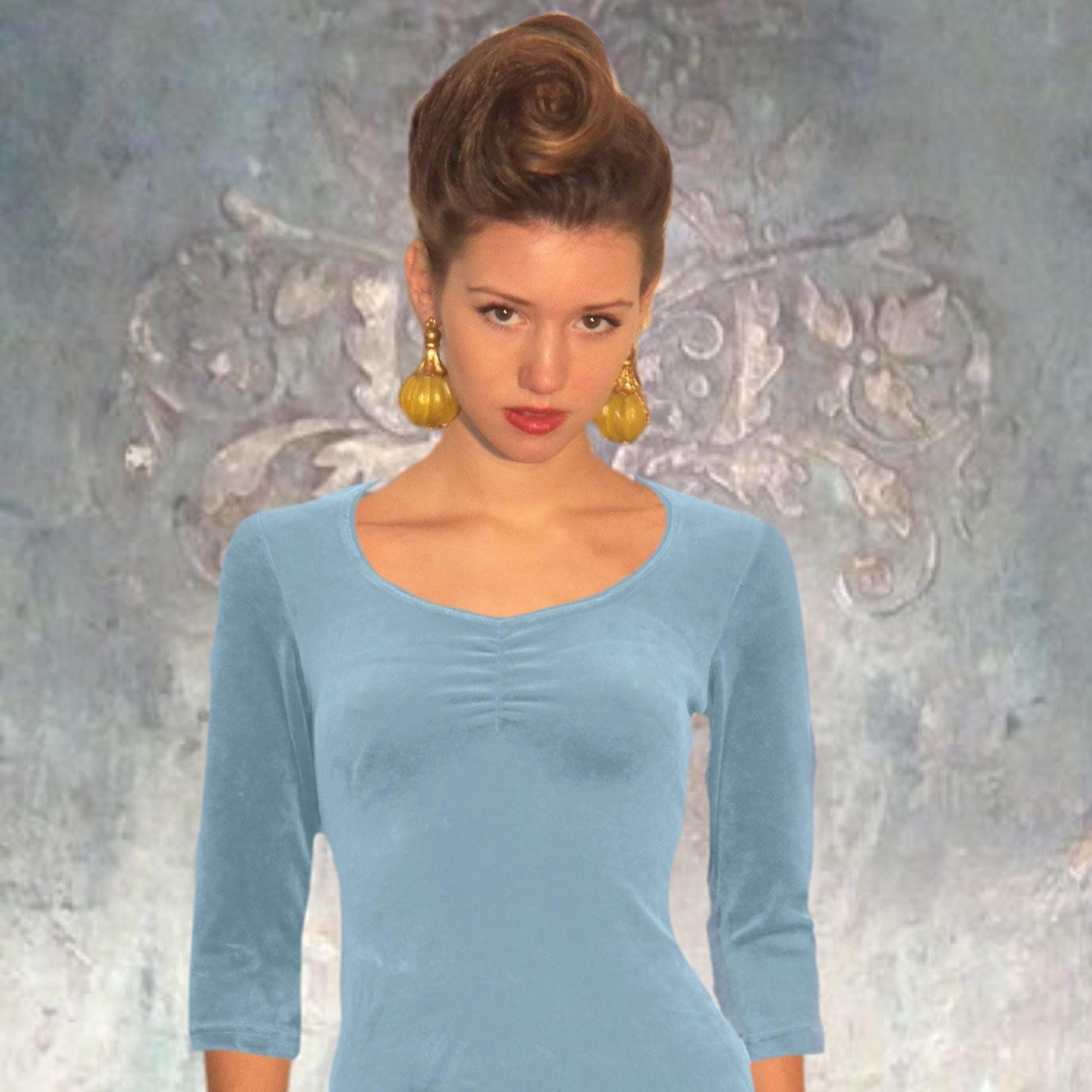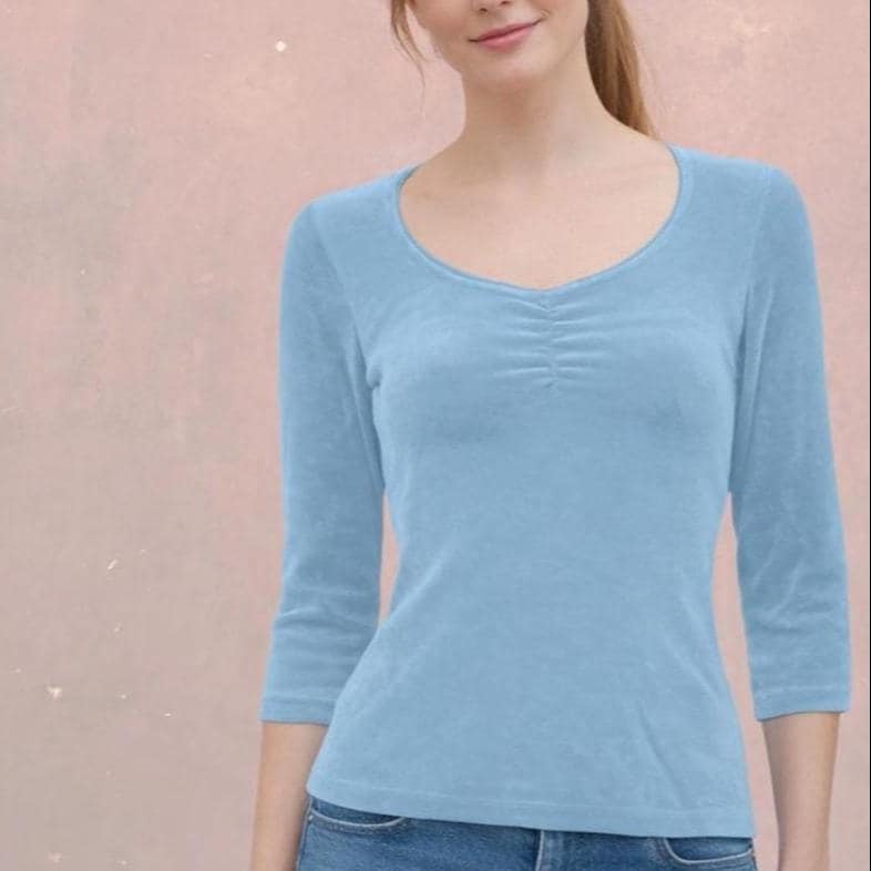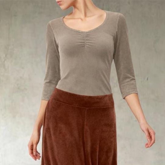 *Basic shirt. Deep drop shaped neckline, finished with jersey binding. Wrinkles on the chest. ¾ Sleeve. The organic velvet gives the shirt a rich appearance; and ensures a perfect wearing comfort.