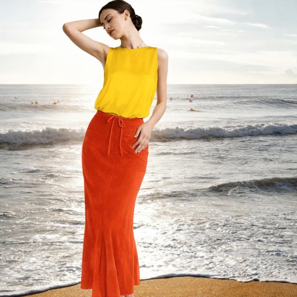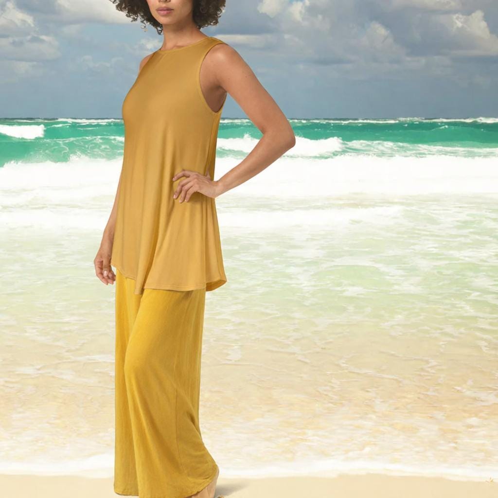 *Sleeveless A-line shirt, made of very supple Tencel, soft and shiny and feeling as silk.