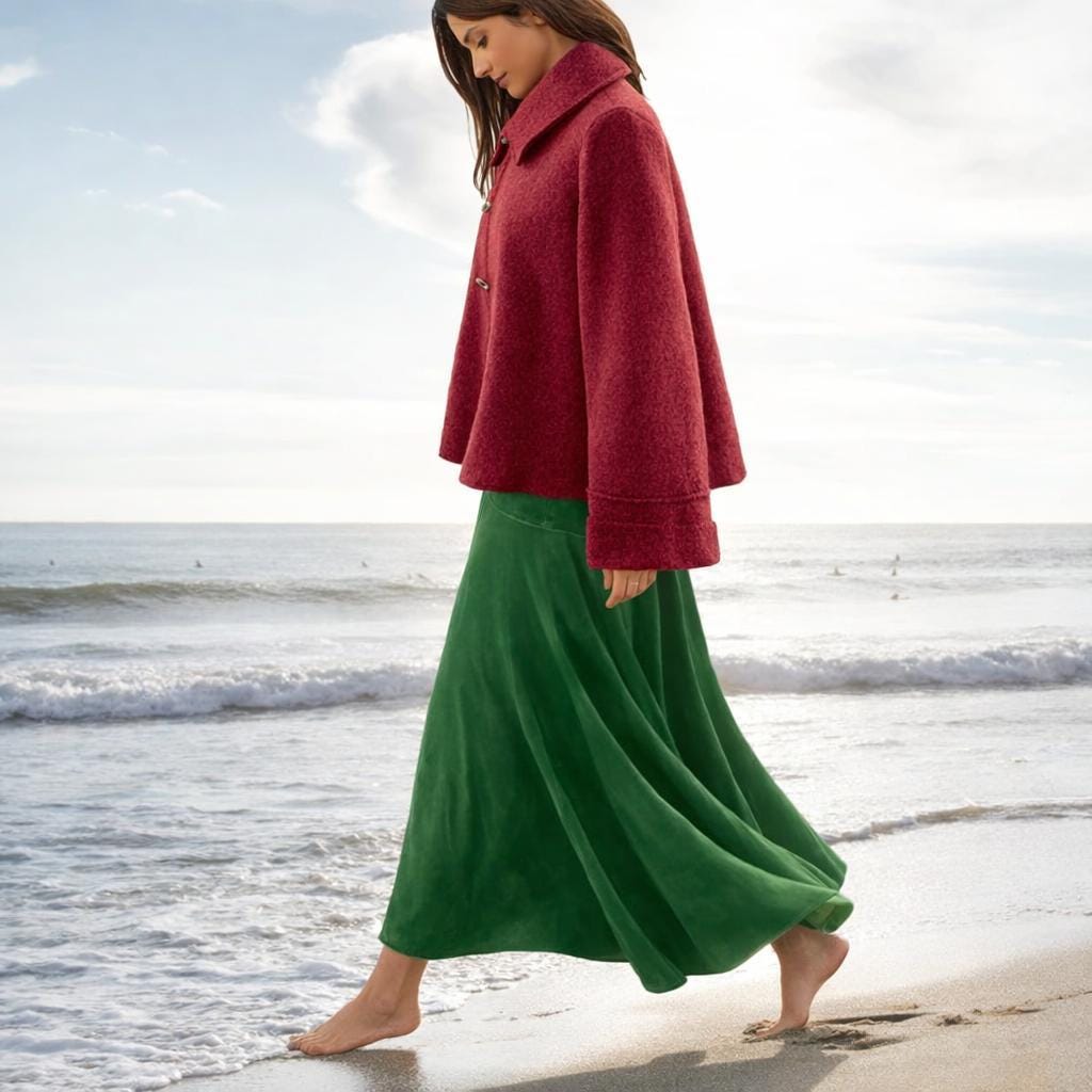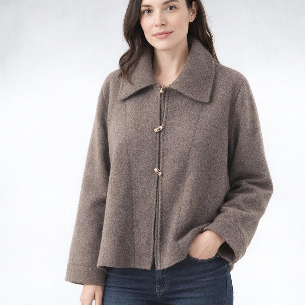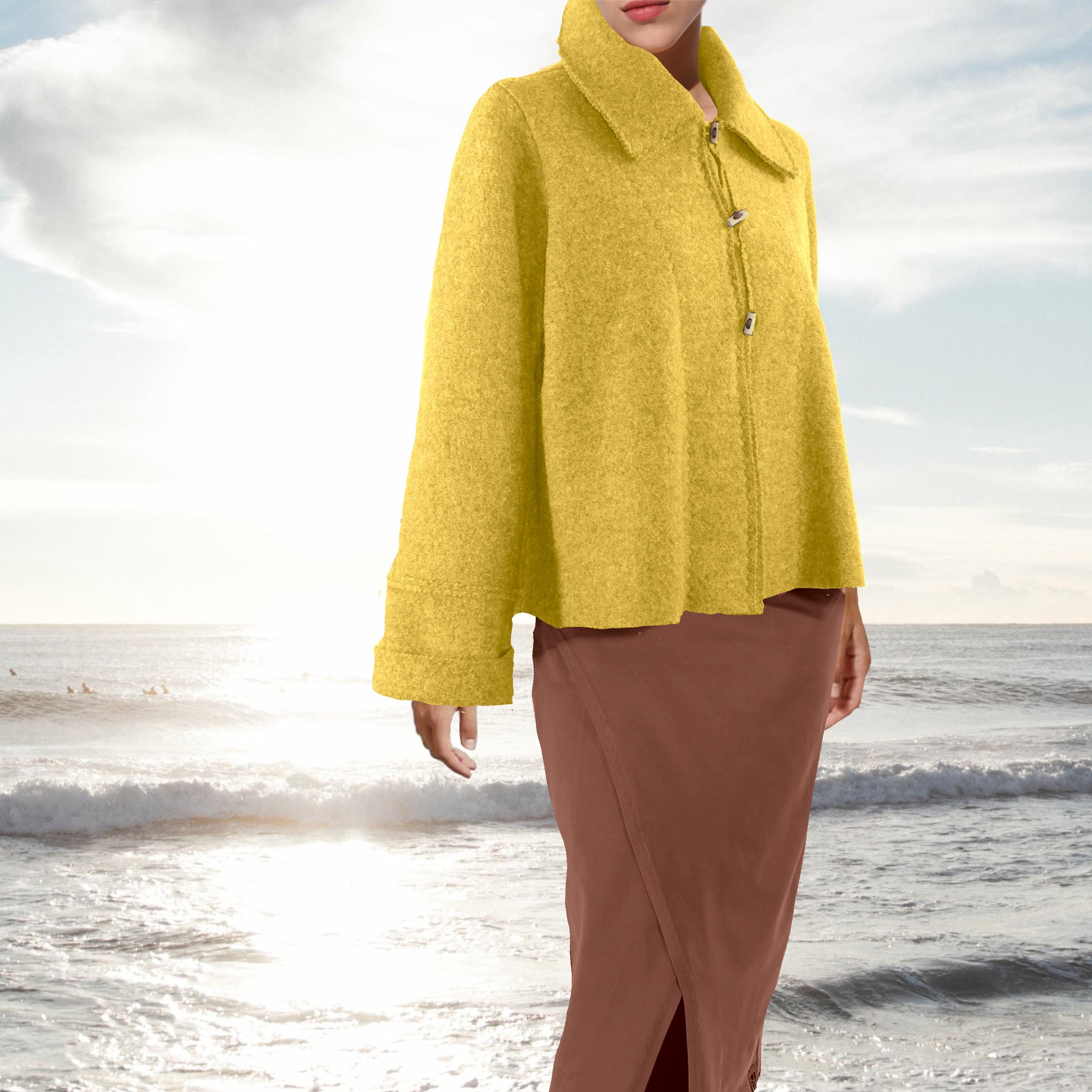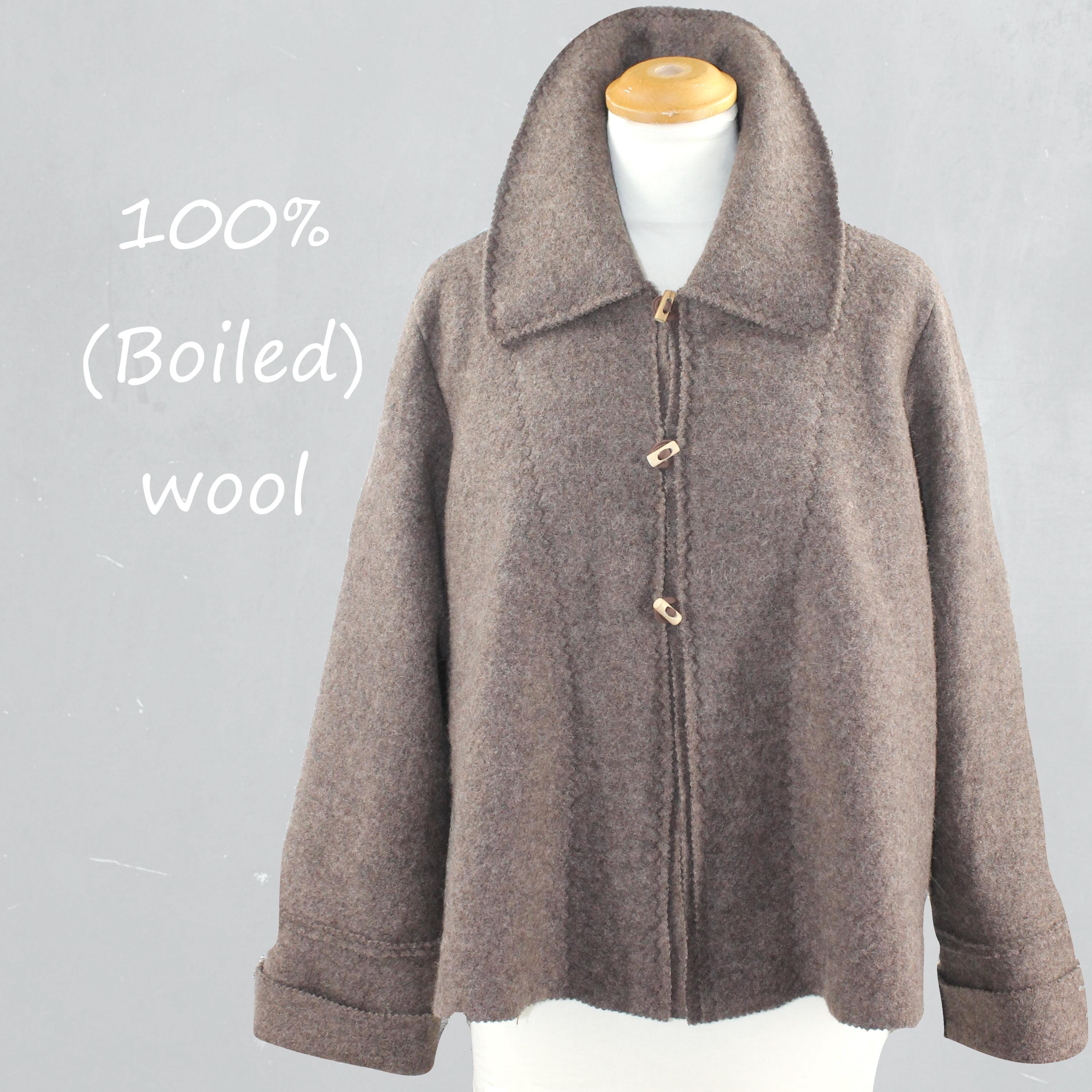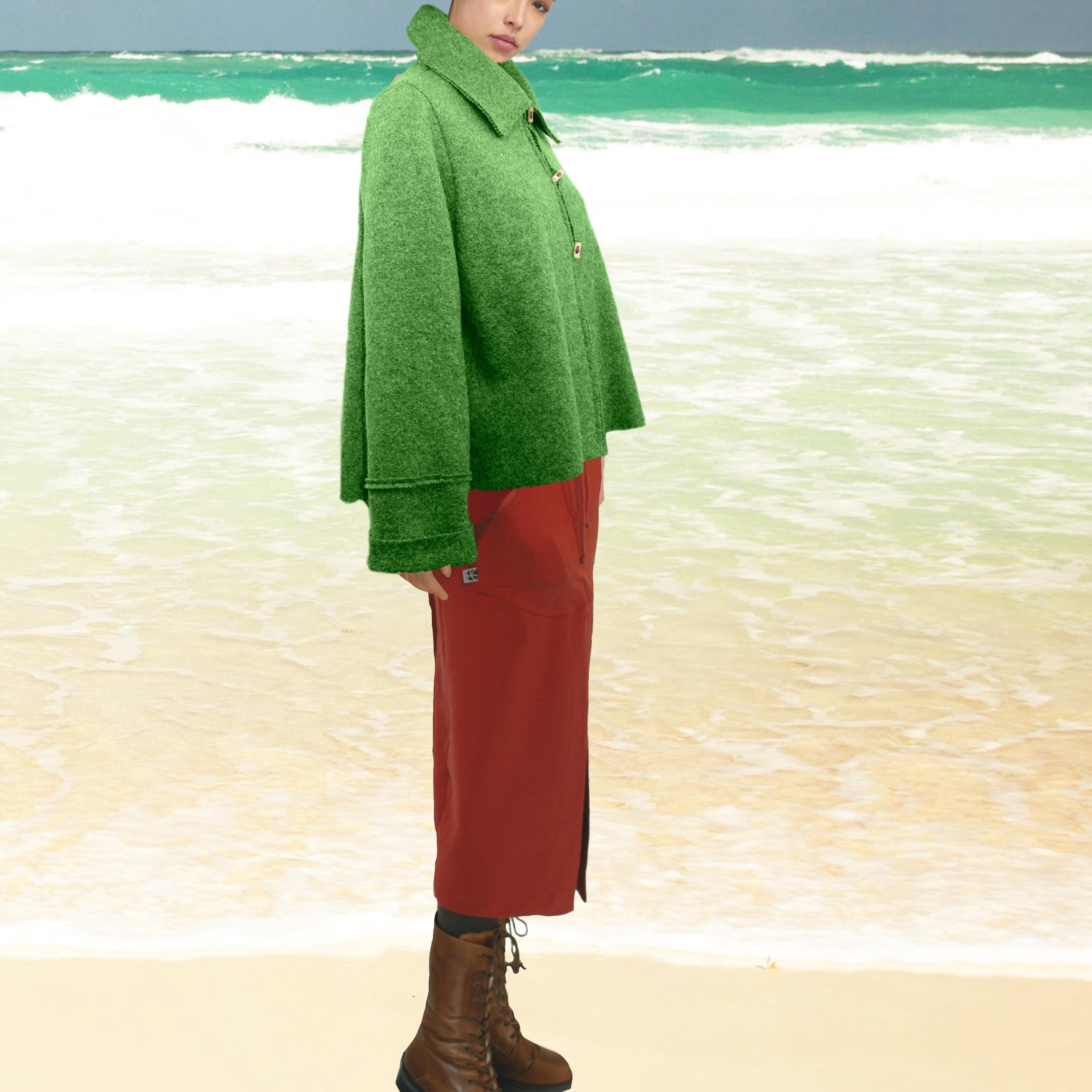 *The A-line cardigan-jacket has a characteristic round collar and duffel coat closure. Made in comfortable and warm boiled wool.