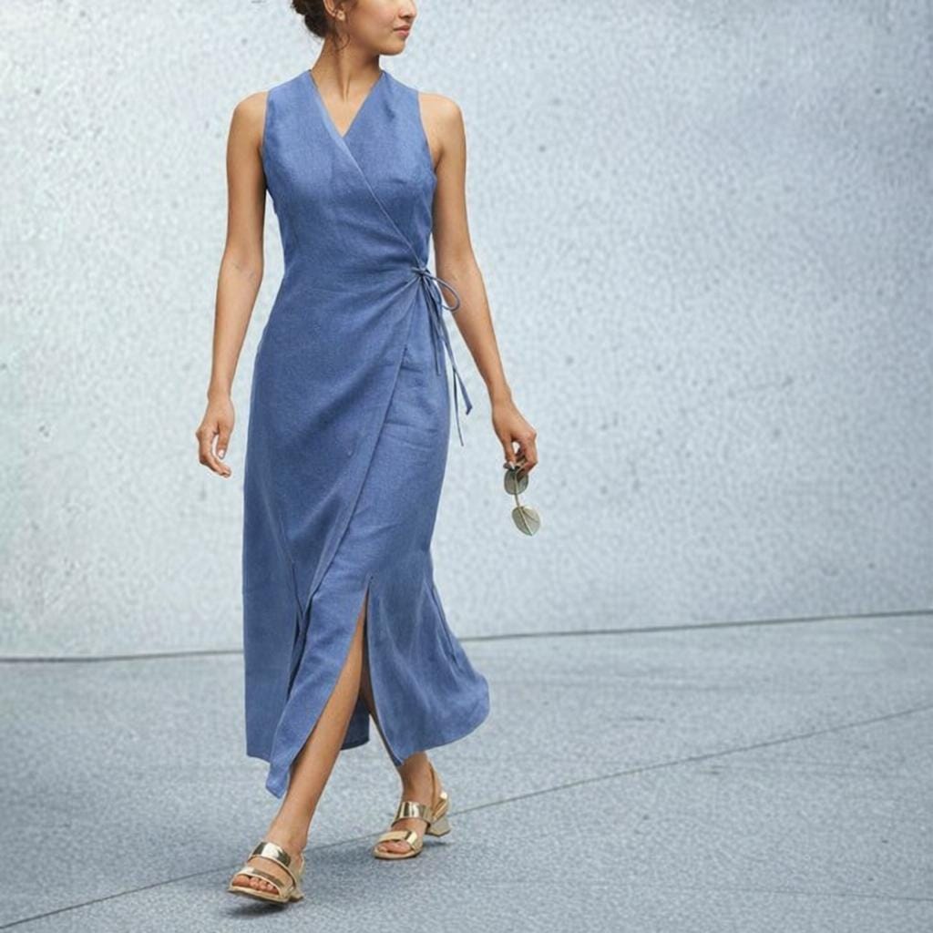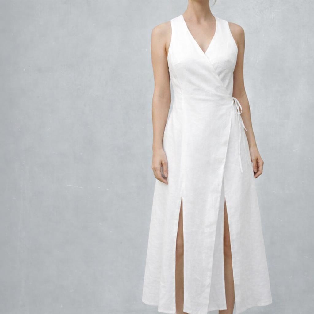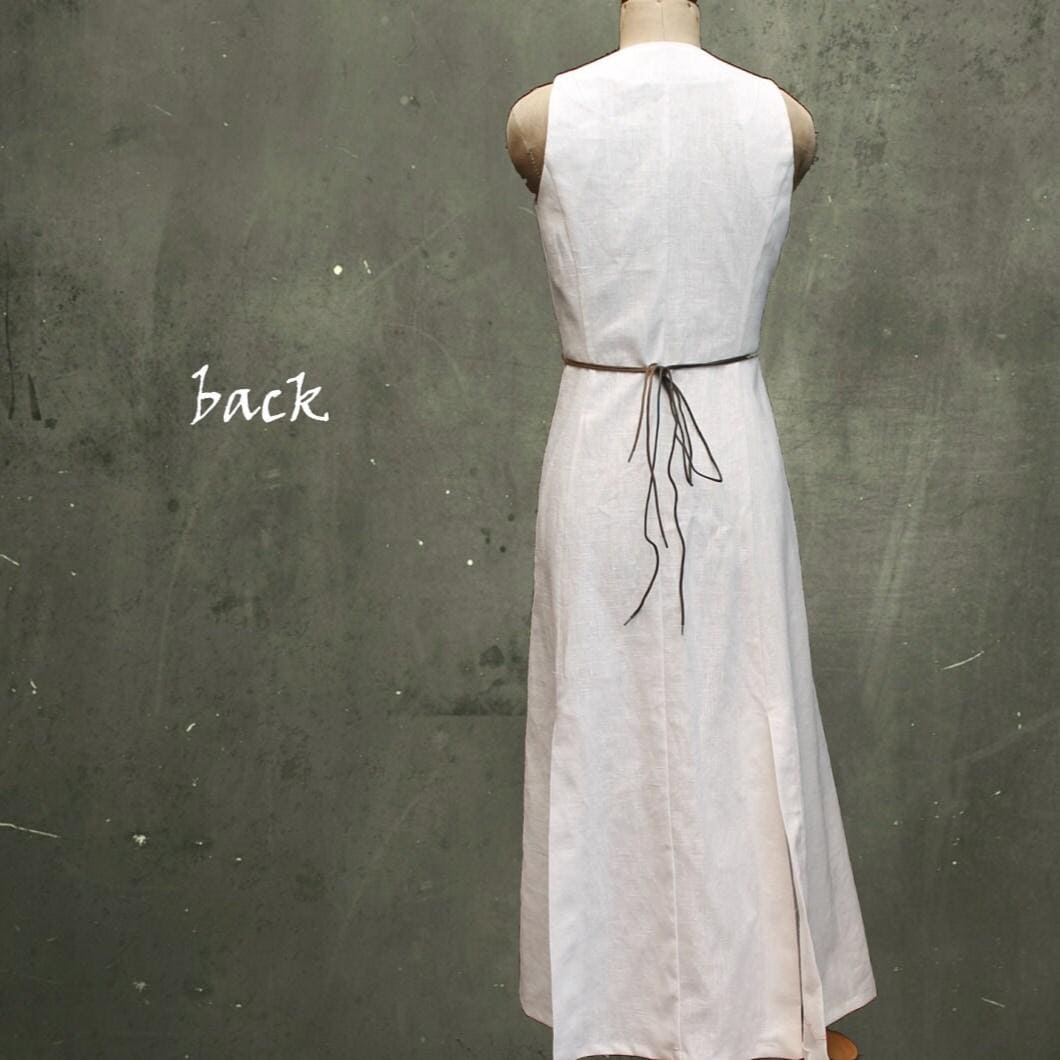 *Long, ankle length linen wrap over dress. The dress has a slightly fitted body and a flared skirt with slits. The dress has a leather string closure. It is made of 100% biological linen. With this design we have strived for a garment which is easy to recycle: on the way to a waste- free society where everything is recyclable or at least biodegradable we chose with this design to start from 100% monomaterial. This means that no other fabrics than linen are used for the lining or other parts. No tied haberdashery like buttons or zippers are used. The garment can be recycled as such, without disassembling parts.