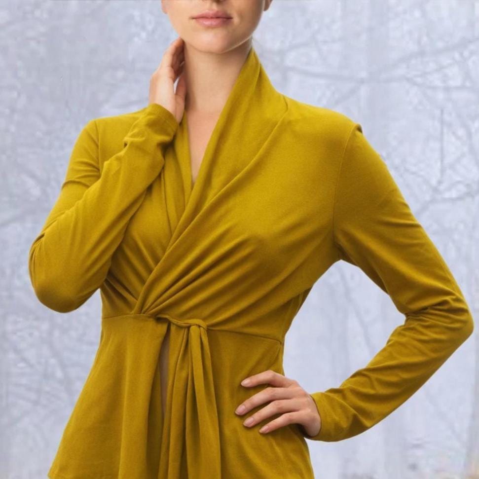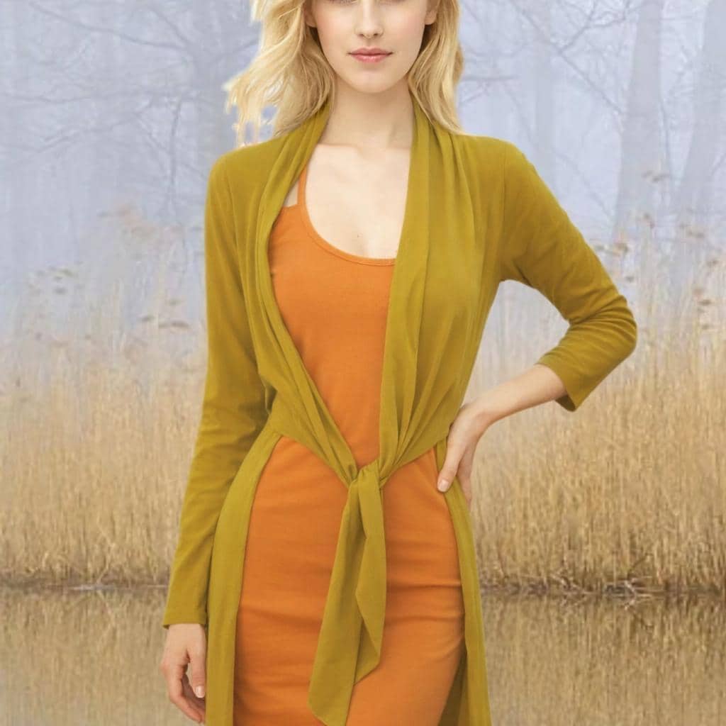 *Close fitting cardigan to the knee. It has a deep, draped collar which can be knotted on the waist in various ways.