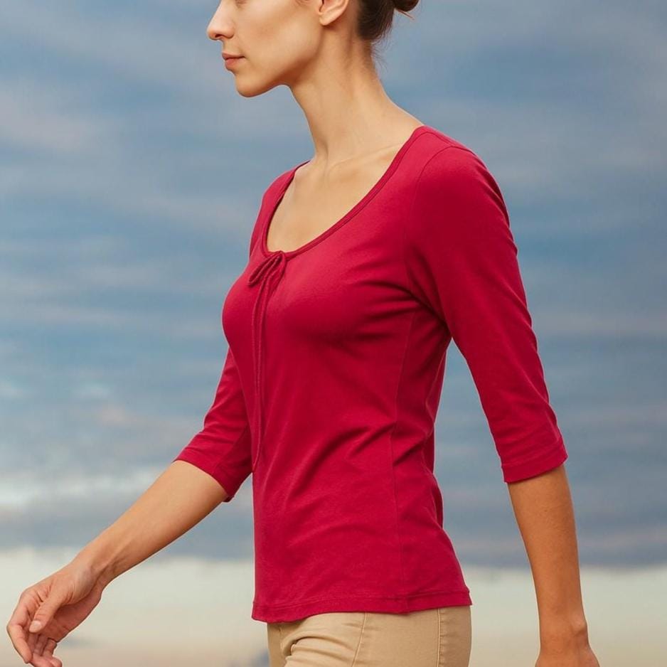 *Close fitting shirt with beautiful deep neckline, finished with a tunnel and string. Three-quarters length sleeves. Extra long, over the hip. Made of strong quality, organic cotton single jersey.