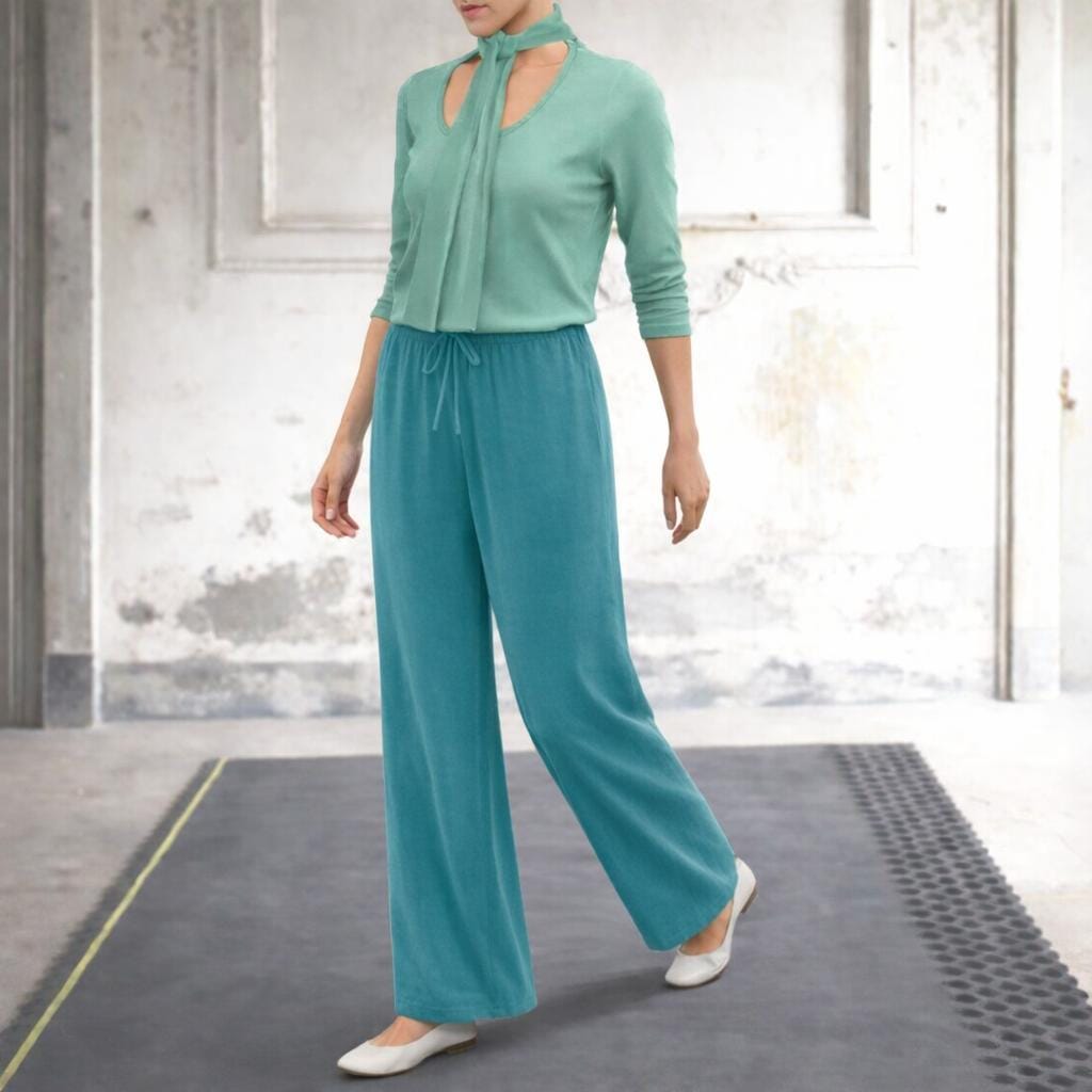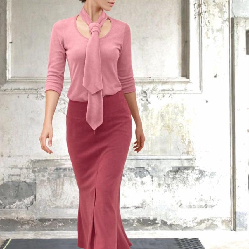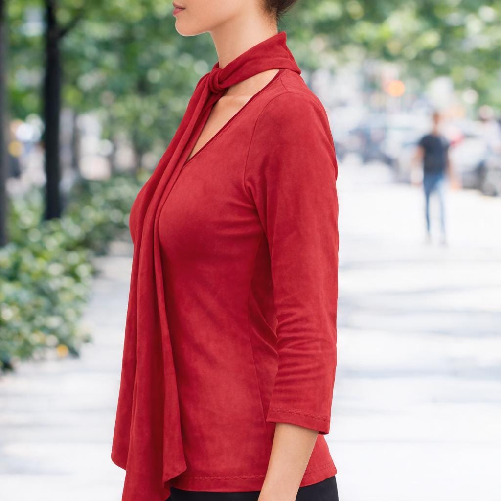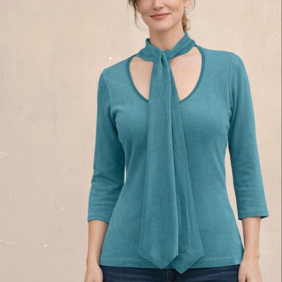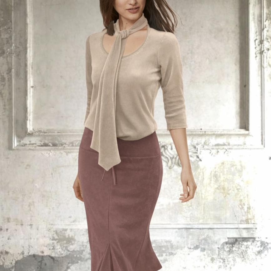 *Festive shirt with long tie. Deep drop-shaped neckline finished with jersey piping. Three-quarter sleeves. The cotton velvet gives the shirt a rich look and ensures wonderful wearing comfort.