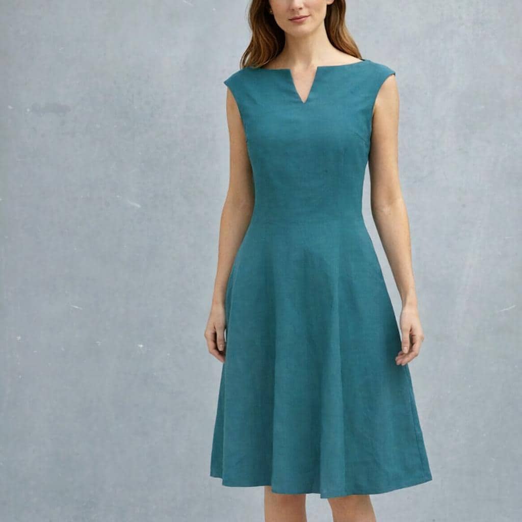 *Slightly fitted linen dress with a distinctive boatneck and a whirling skirt. Patching pleats in the seams create a highly fanning effect in the skirt part. Made of biological linen. Darts on both front and back panel make the dress slightly fitted but going along with chest and waist. Seams from the waist down are sewed with a special technique which create a super whirling skirt part. Zipper in the side seam.