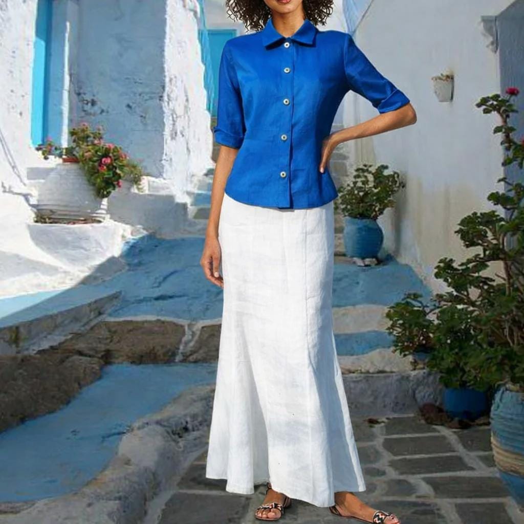*Long, elegant, feminine, hour-glass shaped, linen skirt. The skirt fans from the knee. The wide, round cut waistband has a nice fit at the hip and can be adjusted with a string. Closing with an invisible zipper in the side seam. Made of biological linen.