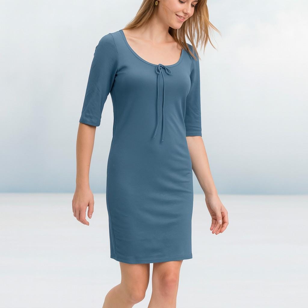 *Close fitting pencil dress. This must-have basic has a beautiful deep neckline, finished with a tunnel and cord. Three-quarter length sleeves. Wrinkles in the center- back seam creating close fitting. Made of strong quality biological cotton jersey.
