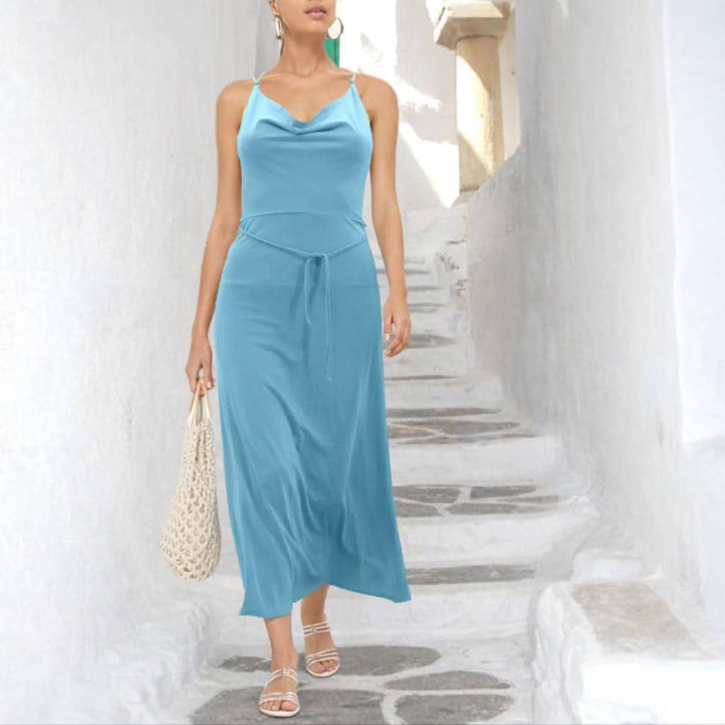 *Model: Ankle-length skirt, fits at the chest and slightly fans from below the bust seam to the ankle. Fits loosely over the waist and hip. Both (two colours) shoulderstraps and waist cord are adjustable. Sporty model, to be wear with low sneakers, flip-flops or sandals or wear the dress chic with high heels.