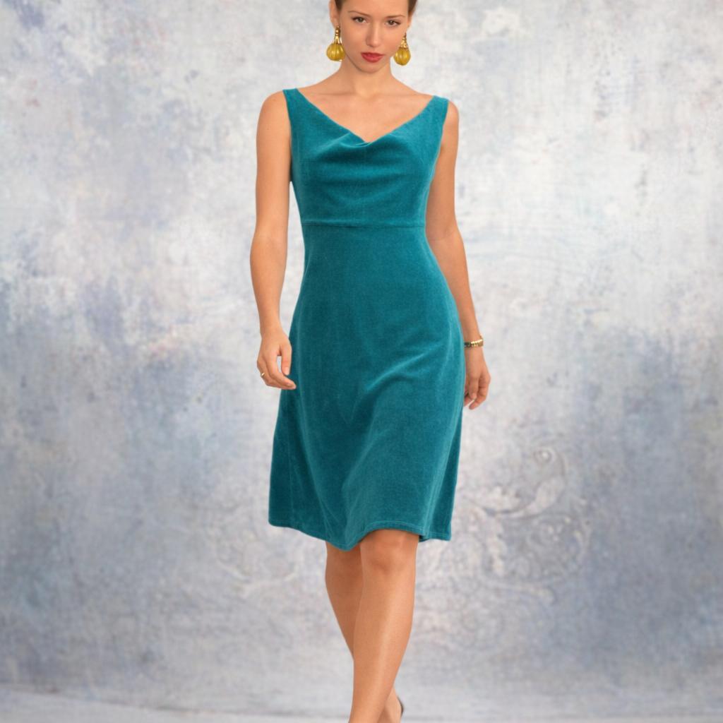Raised waist line and slightly flared skirt. The velvet gives the dress a rich appearance and ensures a perfect wearing comfort.