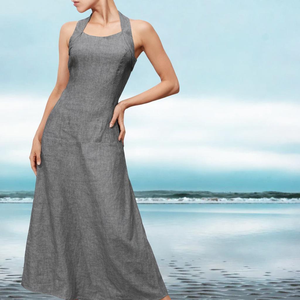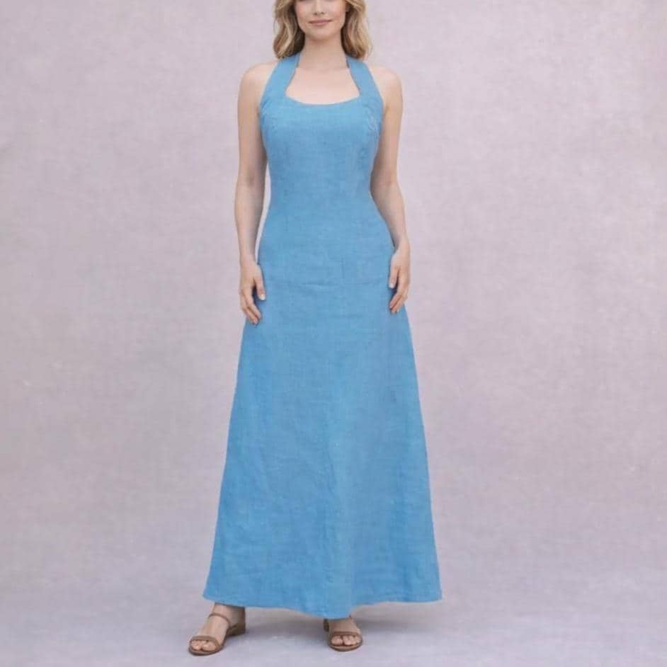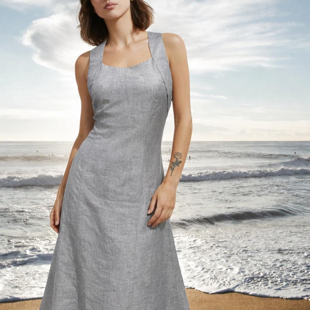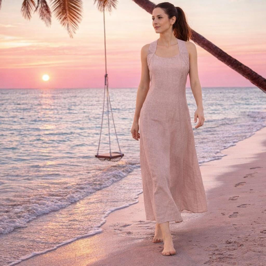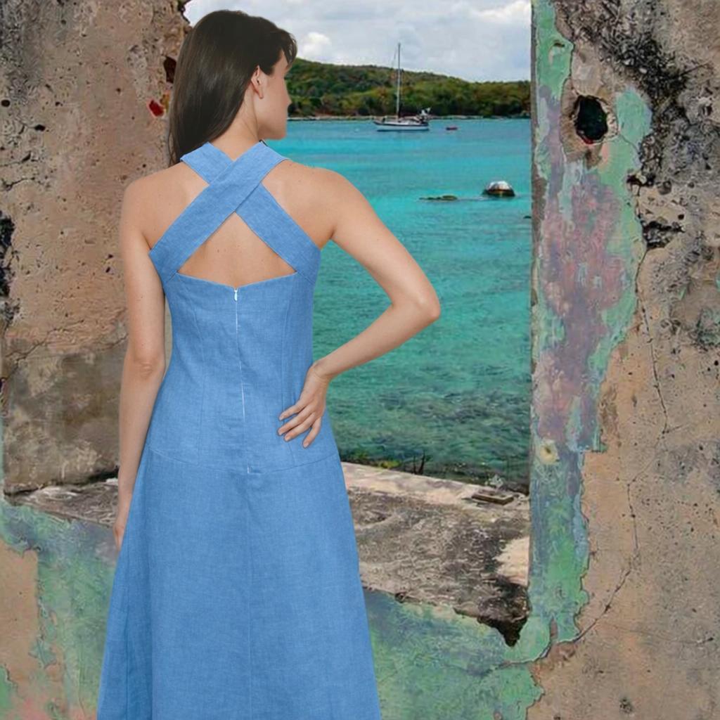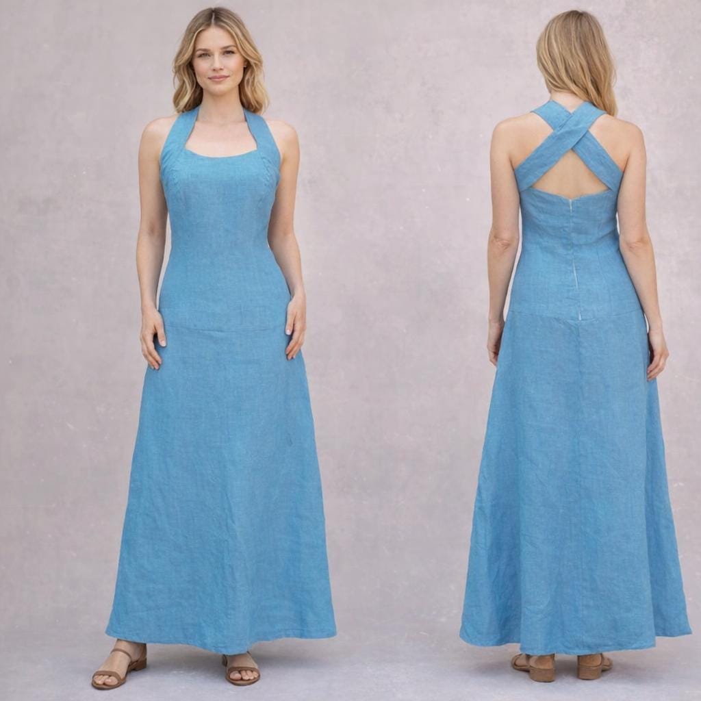 *Long linen dress, made of summery lightweight linen. The dress has partition seams on the bodice and is therefore fitting up to the upper part of the hip. The wide shoulder straps cross at he back and thus create a nice back cleavage. The dress closes with a zipper at the center front. It flares from the hip.