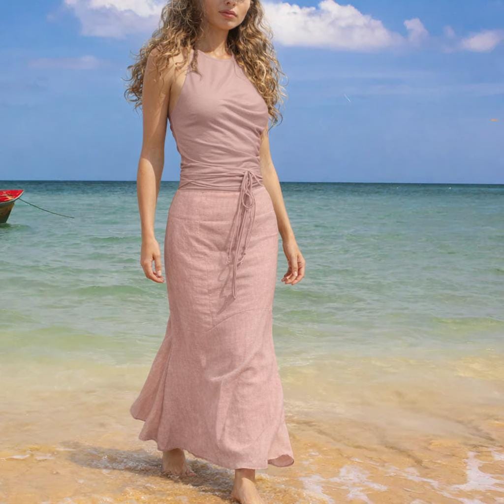 *Long linen summer skirt with an elegant hourglass shape. The skirt is made of supple summery lightweight chambray linen. The skirt is fitting (partition seams) reaching to just above the knee and from there flaring down to the ankle. The dress closes with a zipper at the center front and can be adjusted with a jersey drawstring.