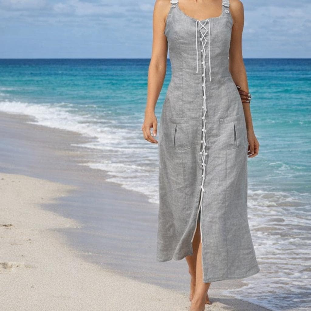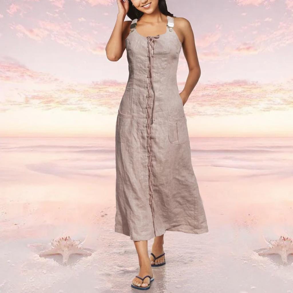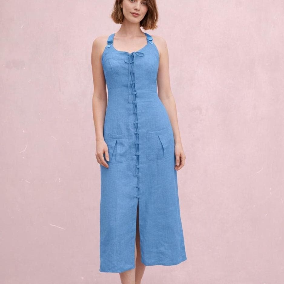 *Long, linen Pinafore dress/American jumper. Made, in "worker/overall" style, of summery lightweight linen. The dress has partition seams and is therefore very comfortably fitting. Slightly flares from the hip to the ankle. The shoulderstraps cross at the back and close with adjustable dungeree clips. The pinafore closes at the center front with a string.