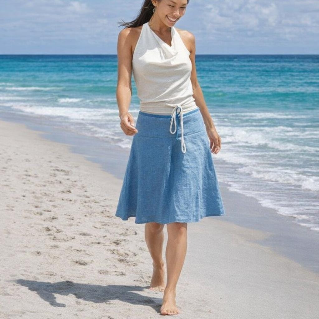 *Summery, billowing skirt. The skirt is made of very supple, airy, summery, lightweight chambray linen. The skirt falls just above the knee, closes with a zipper at the center front and can be adjusted with a jersey drawstring at the waist.
