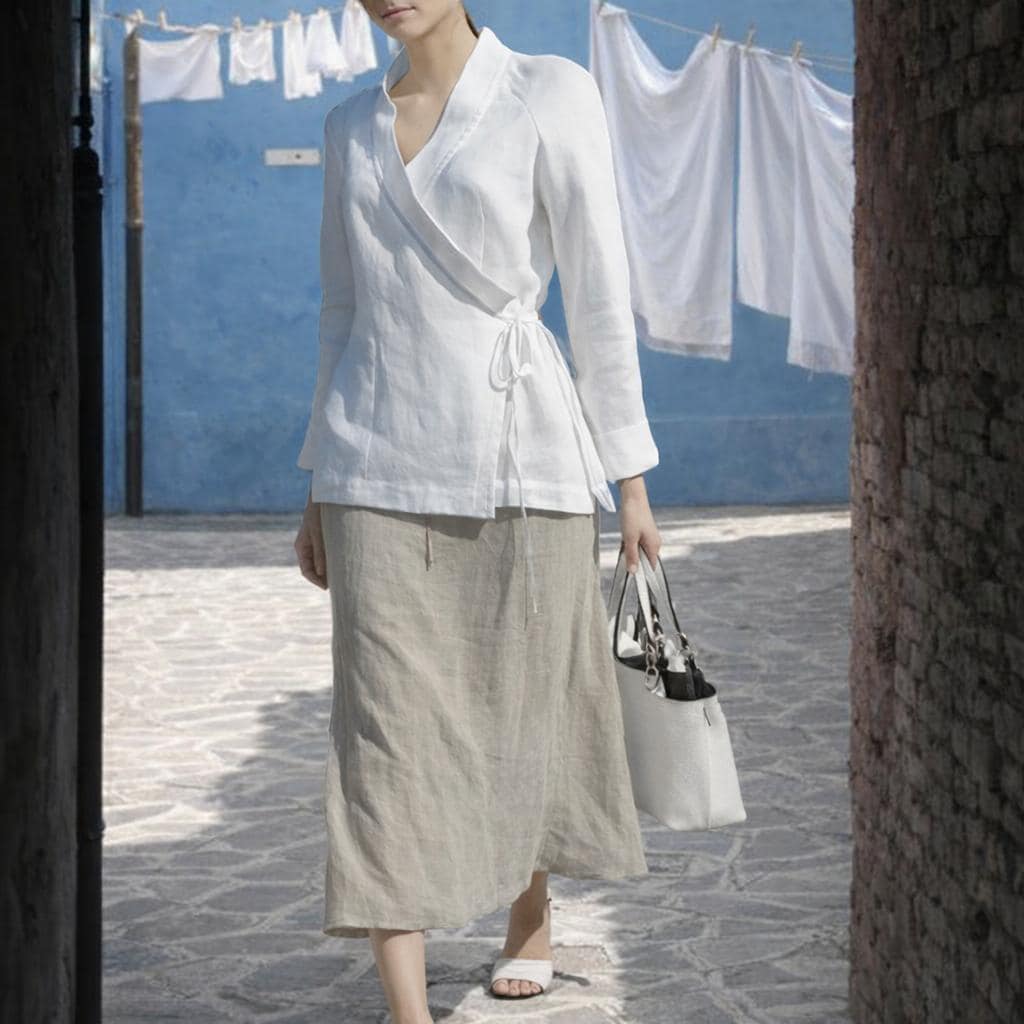 *Loose-fitted kimono made of summery linen. This wrap blouse in kimono design design has semi wide sleeves and an upstanding collar.
