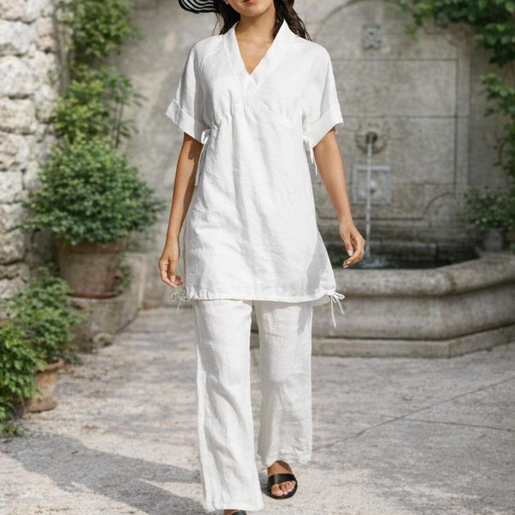 *Kimono tunic made of summery linen. This tunic in kimono design has semi wide sleeves and a V neck with upstanding collar.