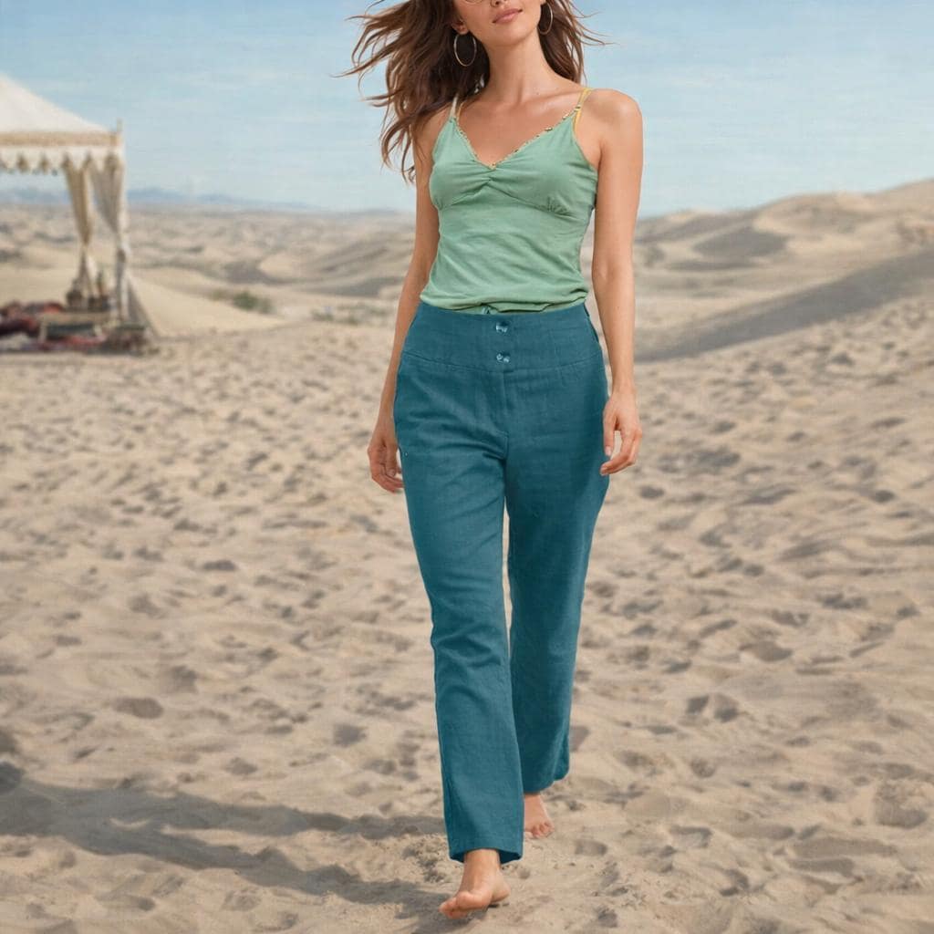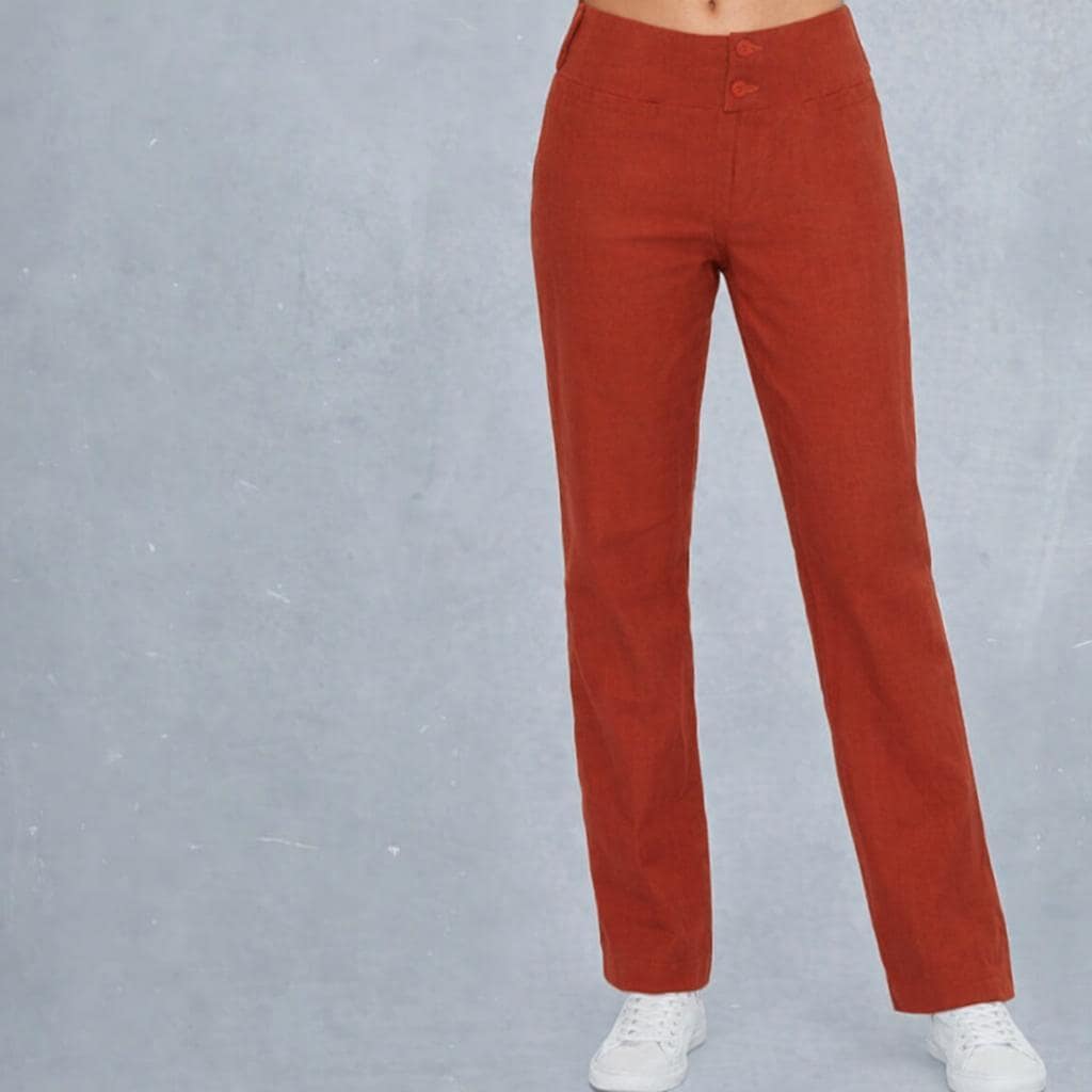 *This linen pants have straight legs. The round cut wide waistband fits loosely on the hip and fits nicely. Two piped pockets, two at the front, and one at the back.