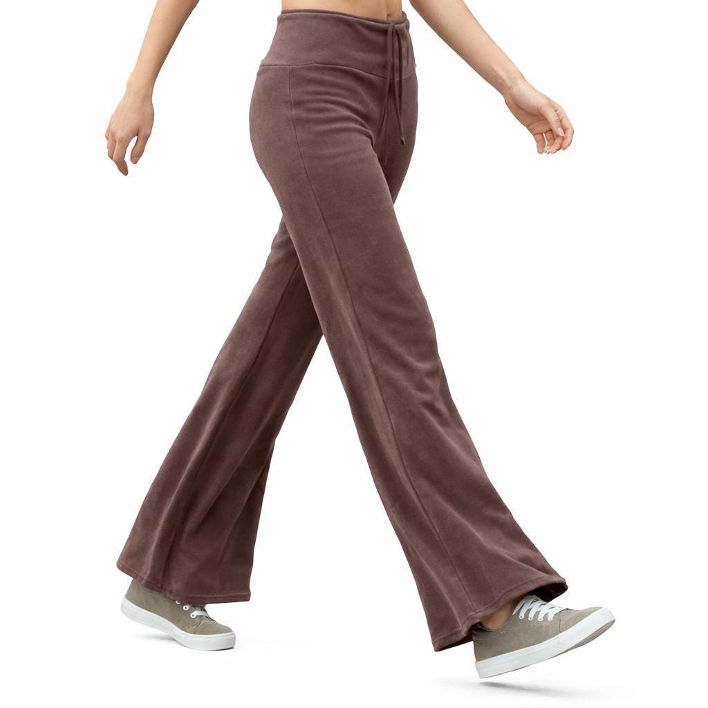 *Flared leg pants in comfortable velvet velours. This in the waist and at the hip close fitted pants has a double round cut waistband, finished with a little tunnel and cord. Made of comfortable knitted cotton velvet.