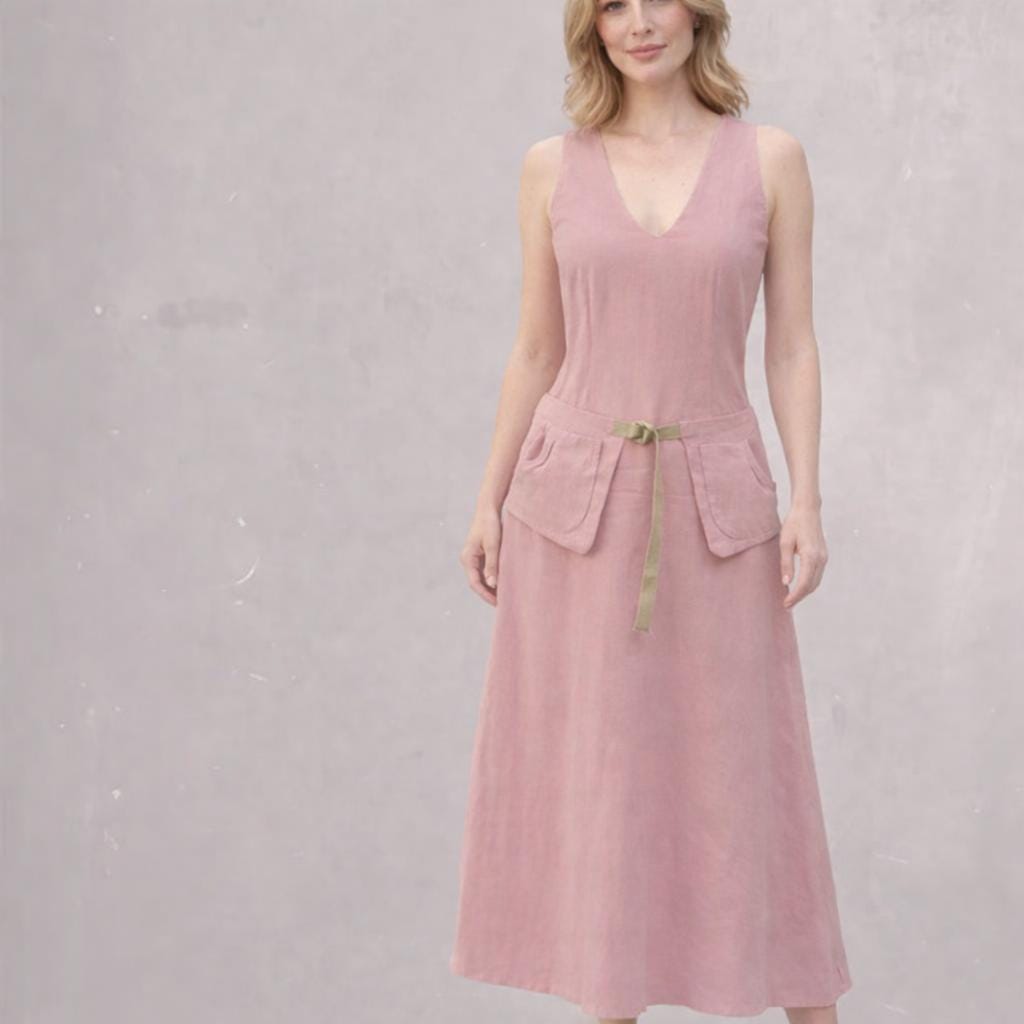*Elegant long dress with separate belt. The bodice has darts in the front and in the back and follows the body beautiful to top hip. The dress closes with a zipper in the side seam, has a summery deep V-neck and a flared ankle-length skirt. The belt makes the dress very special, but also worn without belt remains a simple but beautiful model.