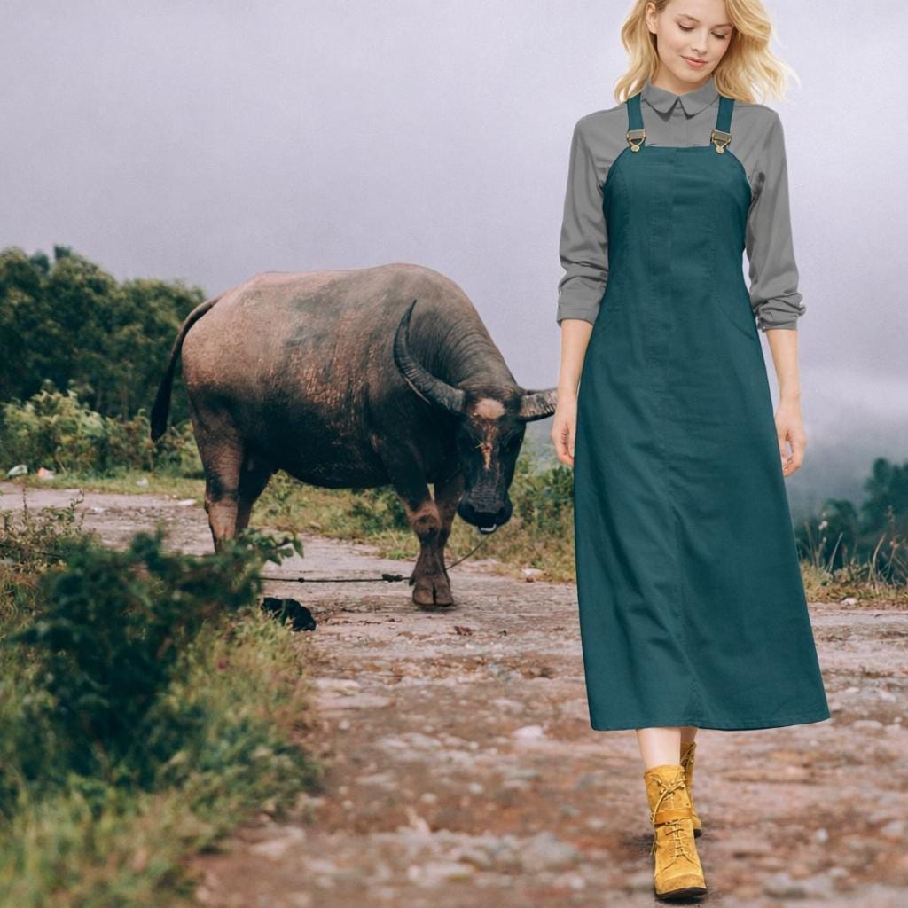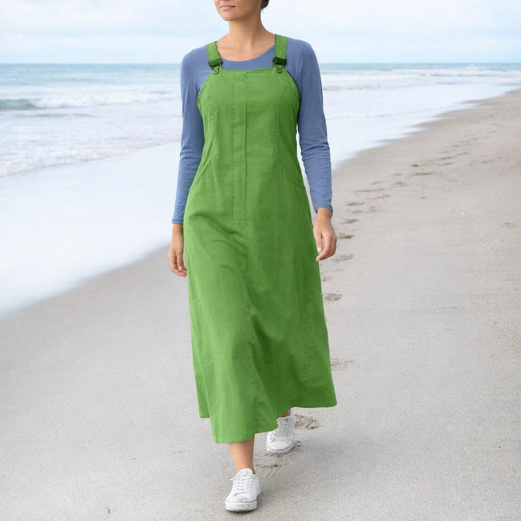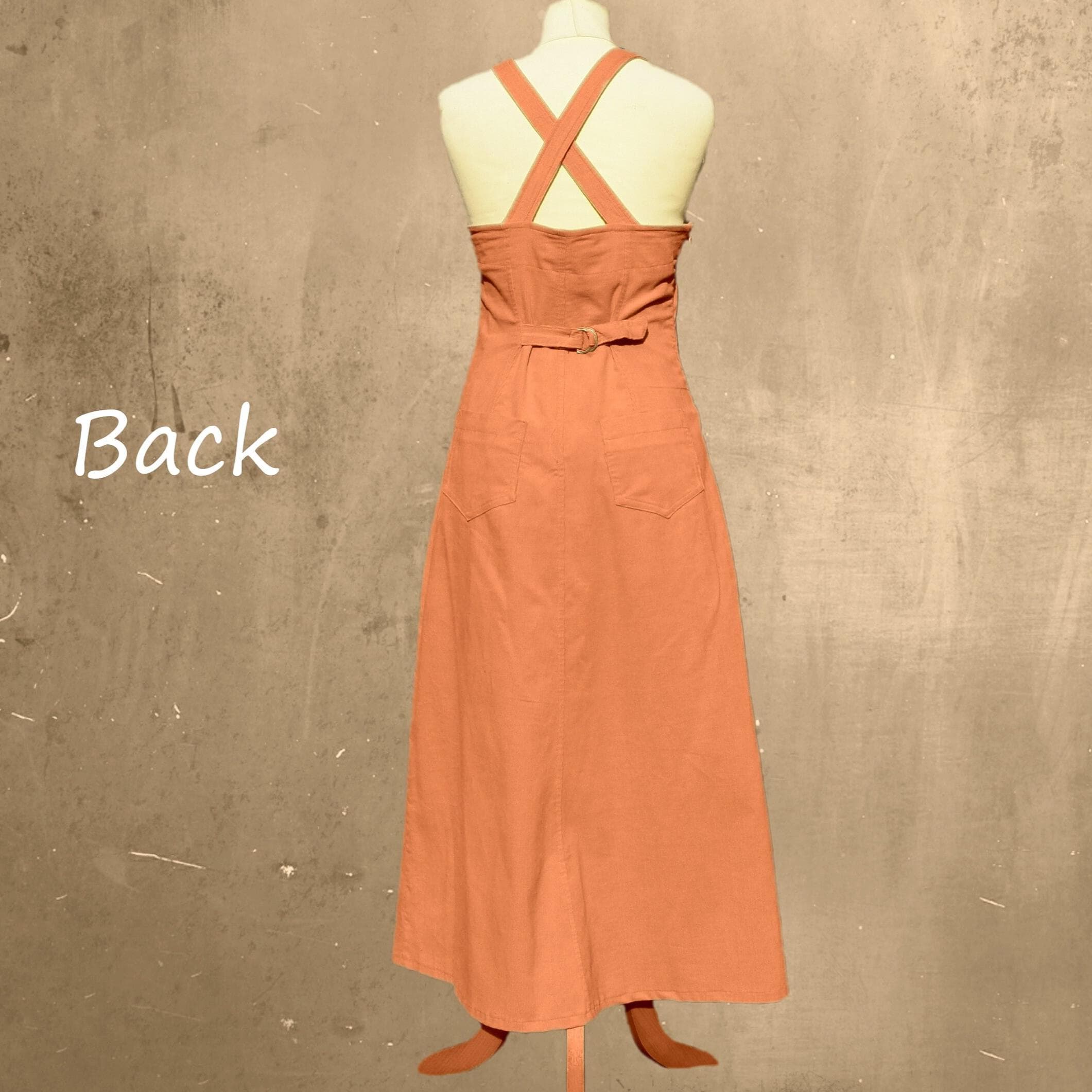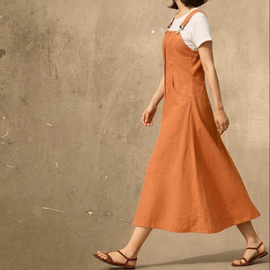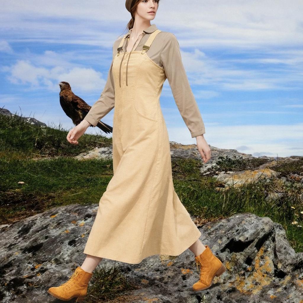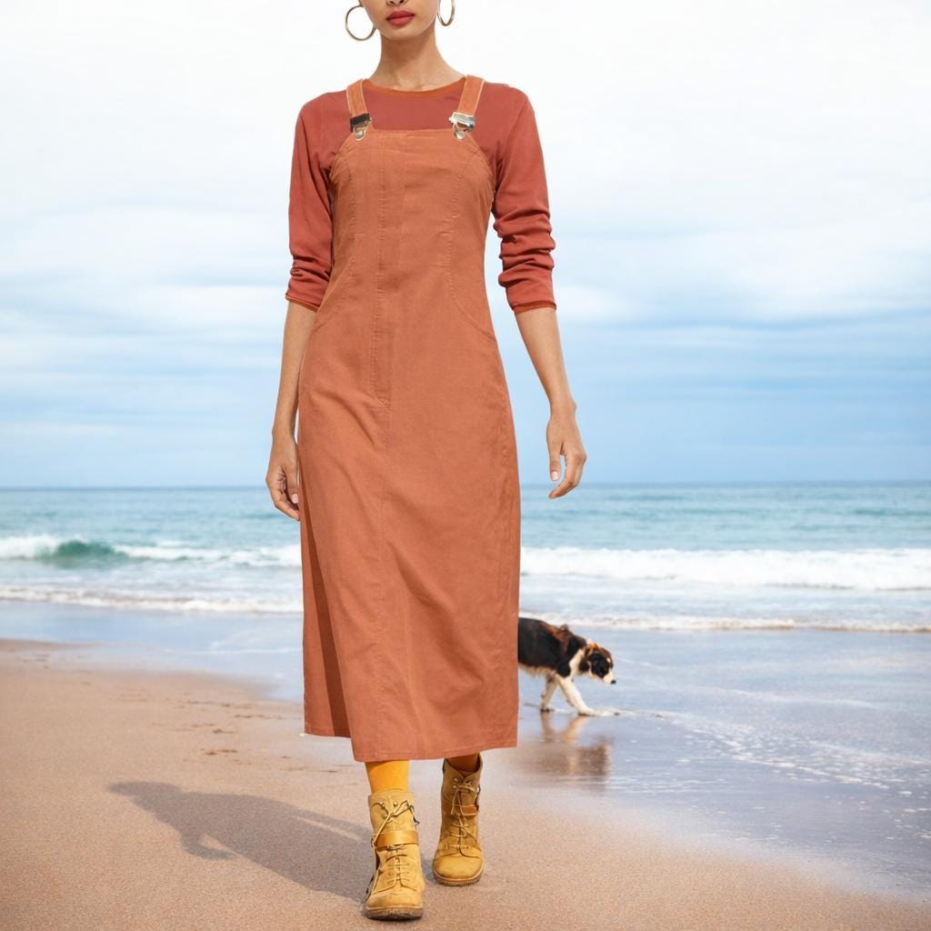 Trending ankle-length pinafore dress in smooth corduroy. Beautiful female fitted bodice with flared skirt. Front and back pockets. Wear it with a simple T shirt, soft knit or stylish blouse. Great for the autumn and winter wardrobe.