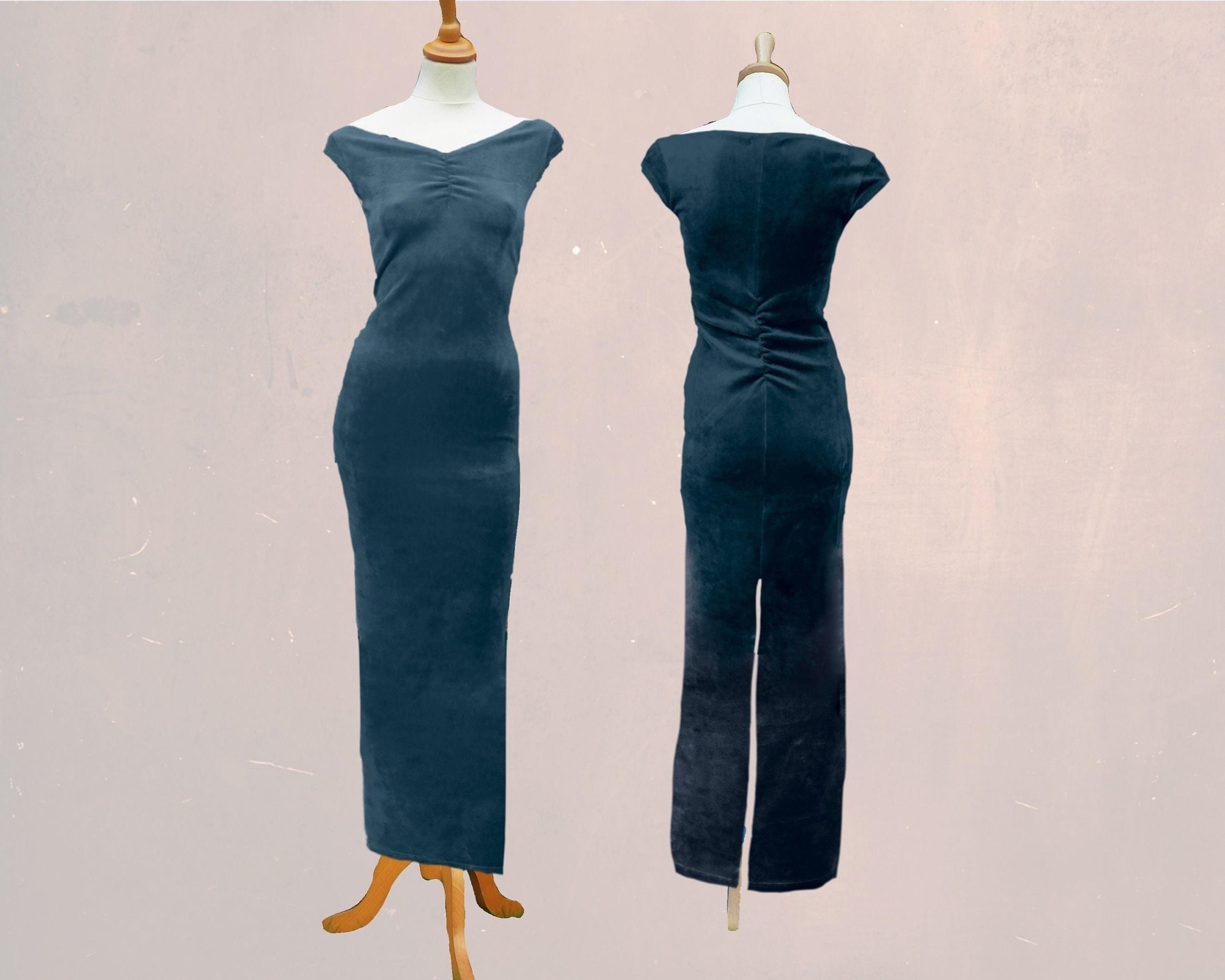 *Close fitted festive maxi dress with deep slit. Made of comfortable stretchy cotton velour. Beautiful boat neckline and cap sleeves are trimmed with a binding.