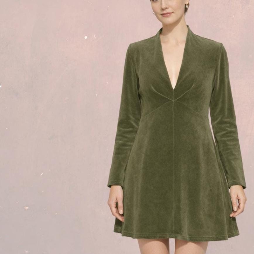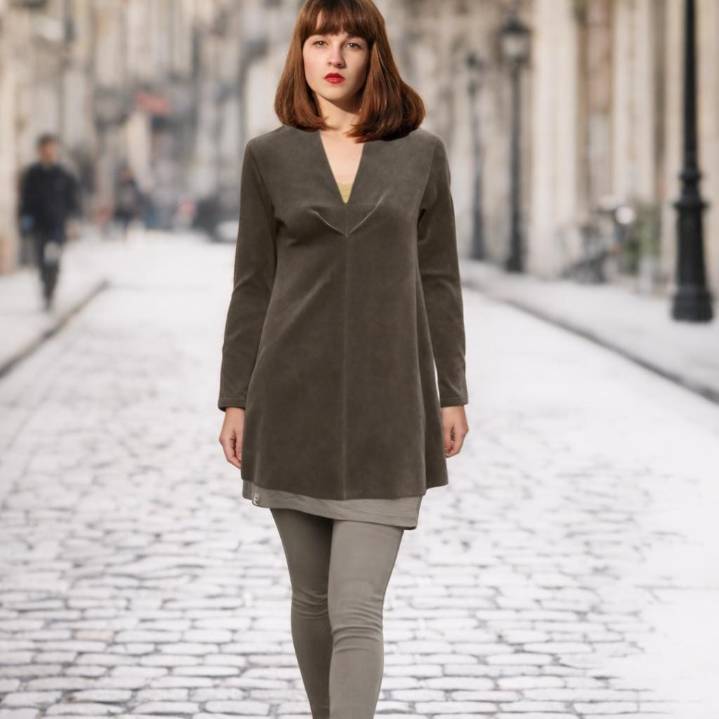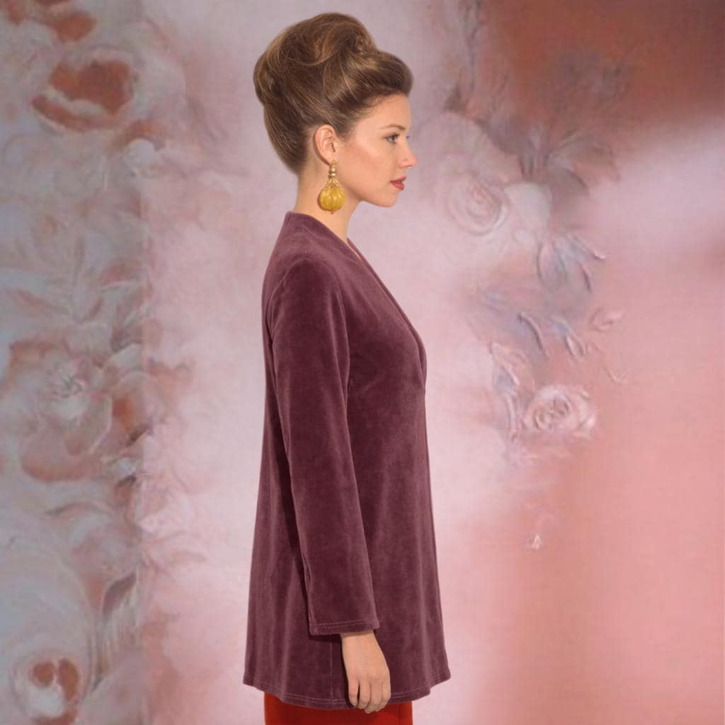 *A line tunic with a pleated deep V-neck. Made of comfortable stretchy cotton velour.