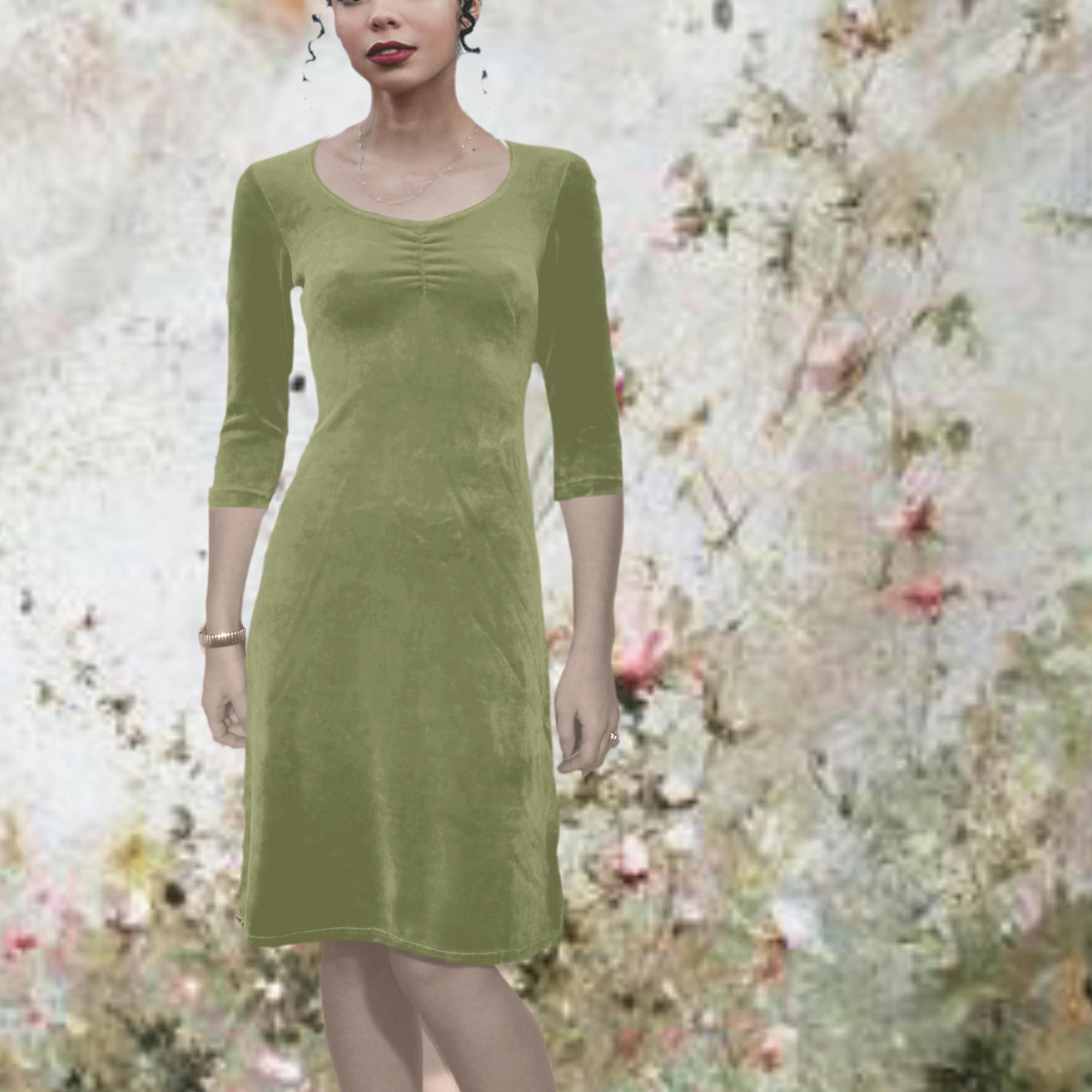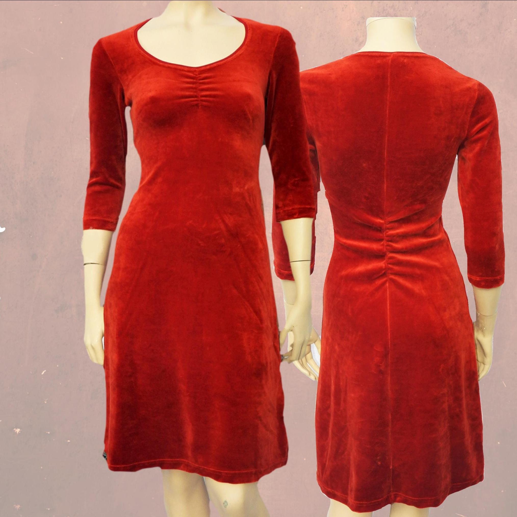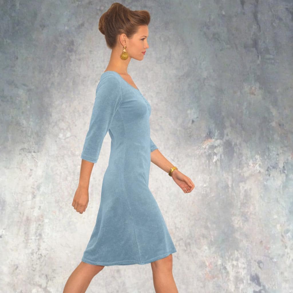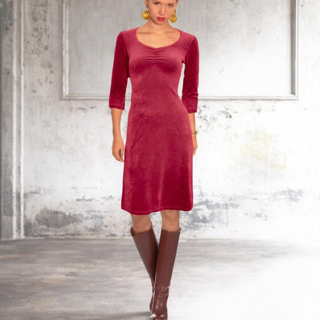 *A-line dress made of cottonmix velvet. The drop shaped neckline is finished with a jersey binding. The wrinkles at the chest and at the back ensure a close fitting. The straight bodice and the swirly skirt give the dress a super elegant and feminine appearance. The cotton velvet provides the dress with a rich appearance and ensures optimal wearing comfort.