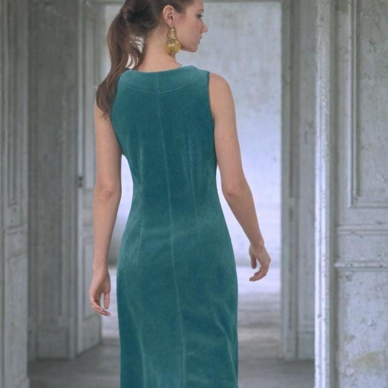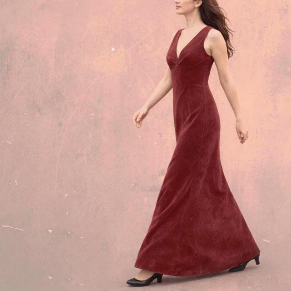 *Model: Fitted in the waist and hip and fanning out to ankle. Seam under the breast with pleated deep V-neck.
