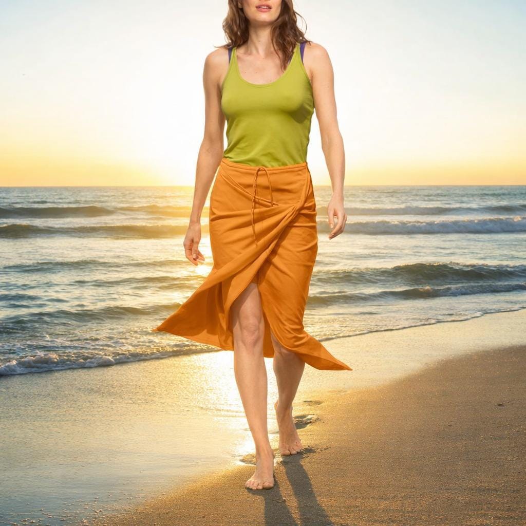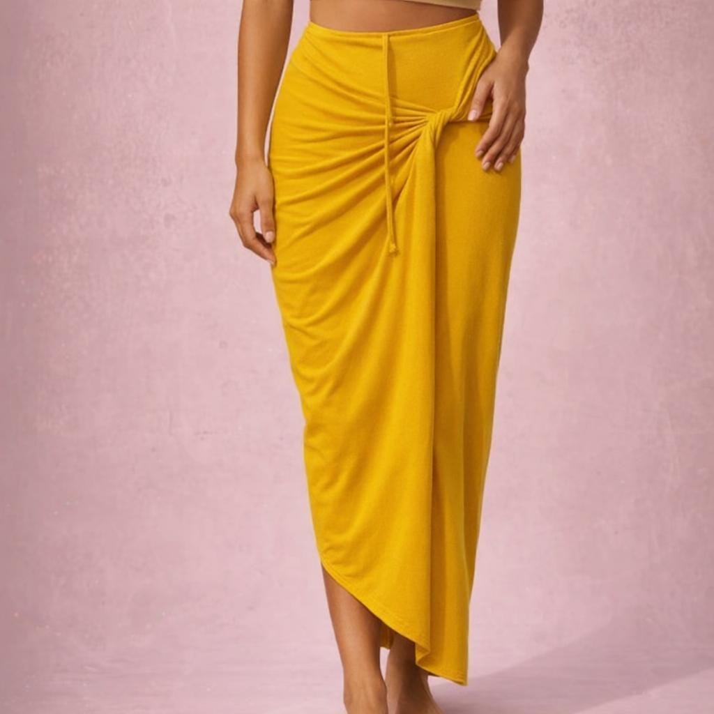 *The fitted pencil skirt has a double round-cut waist/hip part and is finished with a tunnel with drawstring. The skirt has a deep slit. The extra (twisted) front piece covers the slit and makes the skirt very elegant. Made of biological cotton single jersey.